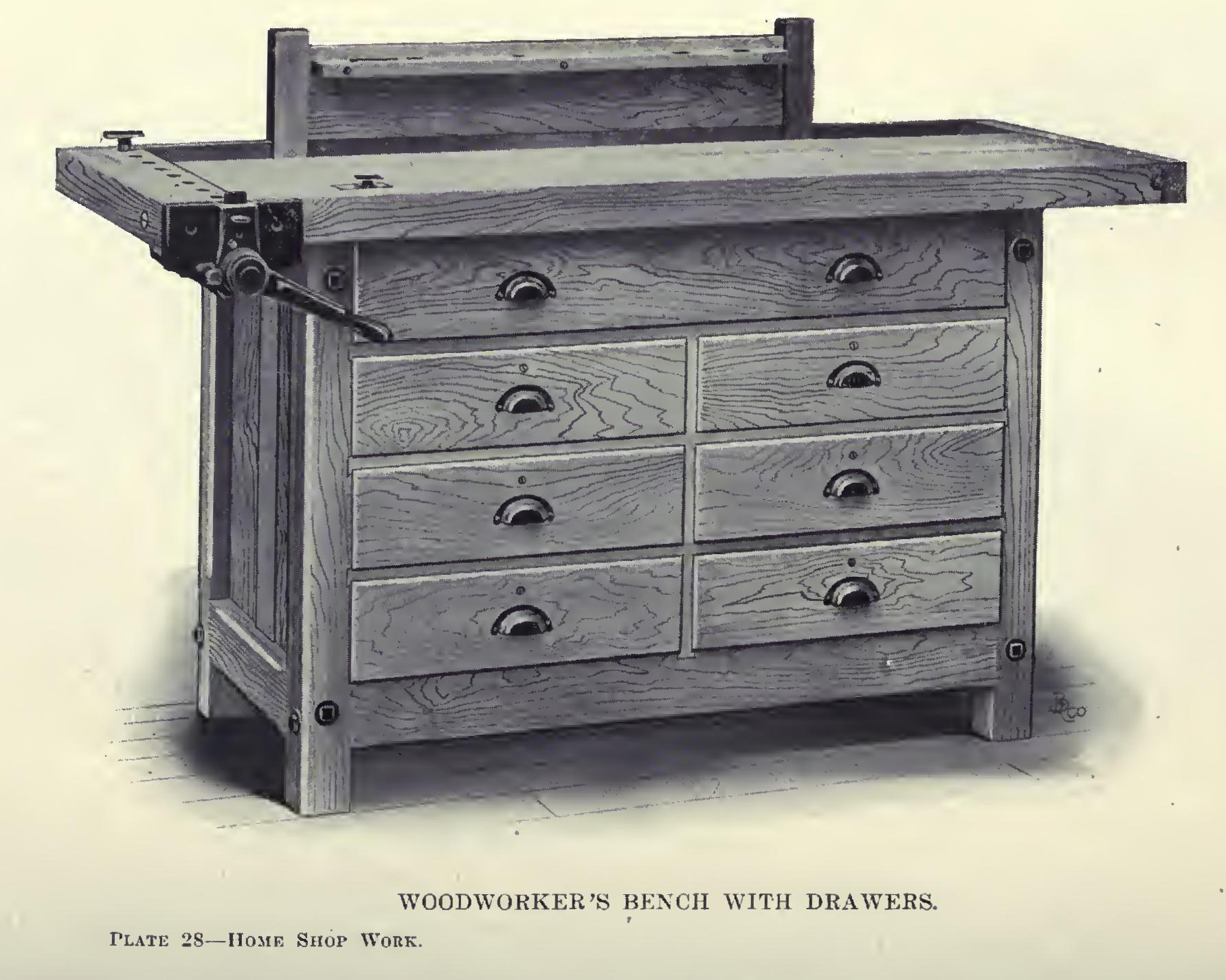This same top construction may be used, and a bench built with the base completely filled with drawer space, as is shown in Plate 28.