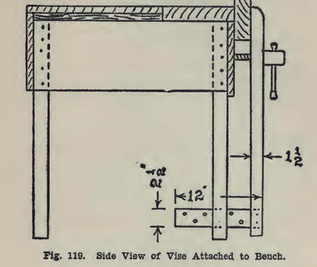 In Fig. 118 is shown a vise in which the movable jaw is inclined somewhat toward the worker. There is an advantage in this kind of vise, in that vertical pieces can be held without exerting any side strain—or at most very little —upon the vise. This position of the jaw also holds the work farther away from the bench's end, which is often of advantage. With this placing of the vise jaw, a "two by six" is used for the bench leg, or two pieces of "two by four" may be cleated together.