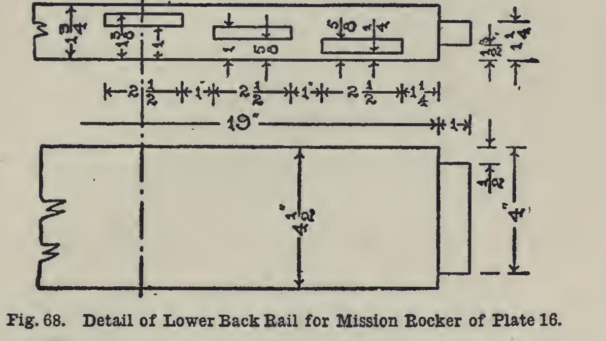 The rails for the back may be tenoned and mortised, the slats cut, and the back glued up next. The top rail is to be laid out to nineteen inches between the shoulders, leaving 1 inch at each end for tenons. Fig. 67 shows the settings of the gauge.