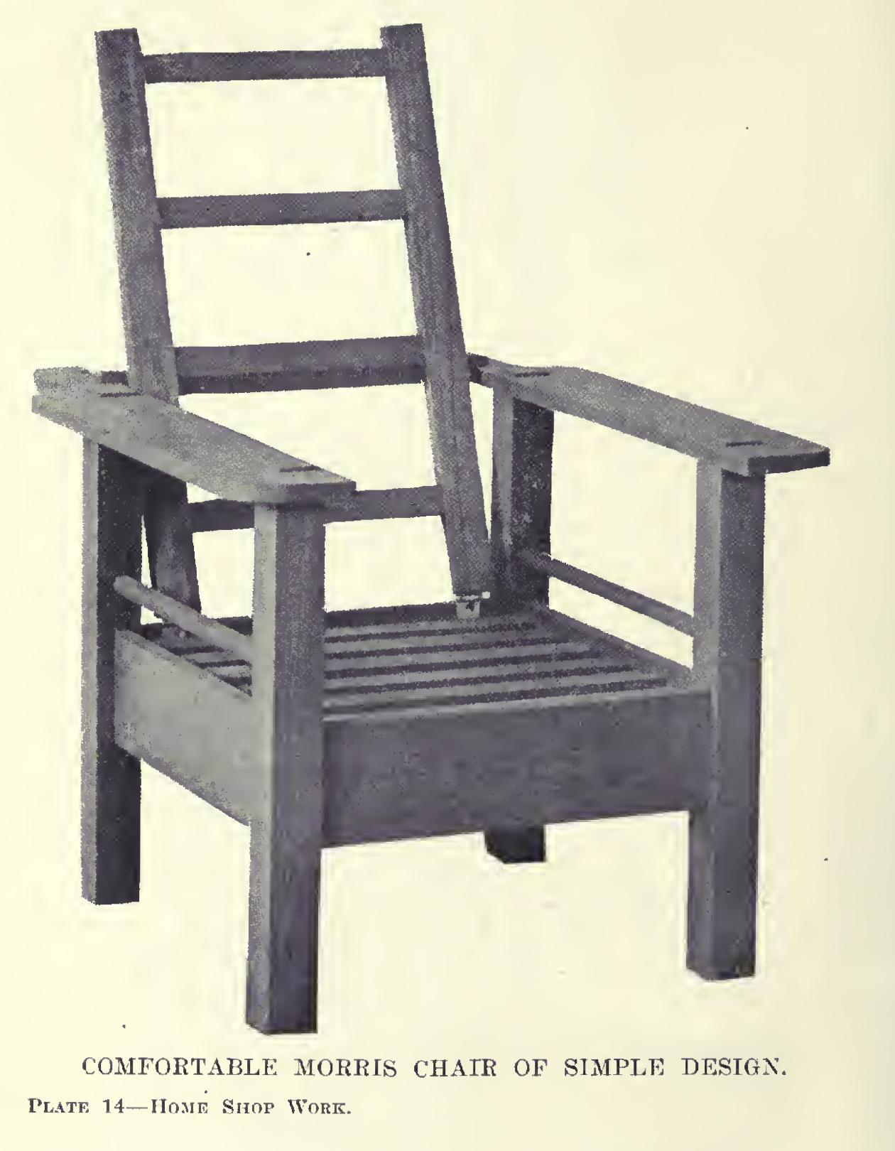 The mortises which are to be put on the sides of the back posts must be laid out at an angle with reference to the edge. The one at the top is to be % of an inch by 3 inches, placed so that its top shall be inches below the top of the post. The lower mortise is to be placed on a level with the one previously laid out on the for ward surface. It should be by inches. The proper angle at which to lay out these mor tises can be got by laying a straight-edge along the leg from the middle of one mortise to the middle of the other, the sides of the mortises being laid off parallel to this line and at the proper distance from it. They are to be cut to a depth of inches.