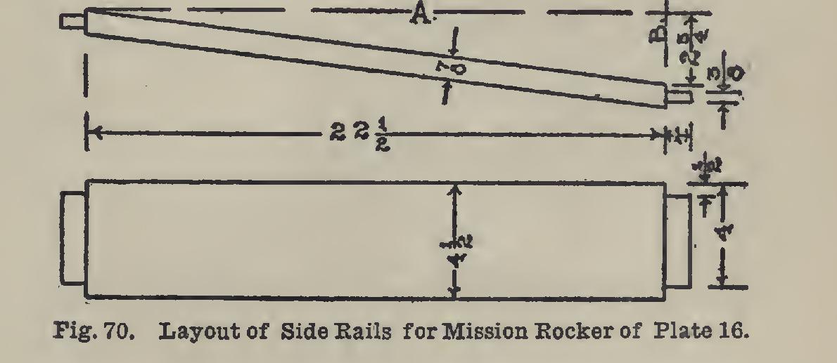 The tenons and shoulders of the side rails must be cut on an angle, the sides of the mor tises having been cut square to the surfaces. The T-bevel should be used to mark off this slope. Fig. 70 gives the layout. Lay the side rail on the bench, or place it in the vise, with the joint-edge up; lay on the steel square so that the outer edge of the blade will take the direc tion of the line A (Fig. 70), crossing the edge at the inch mark, while the tongue will take the direction of the line B, crossing the edge at the mark. Mark along the tongue, and also mark the edge at the mark, to indicate the length.