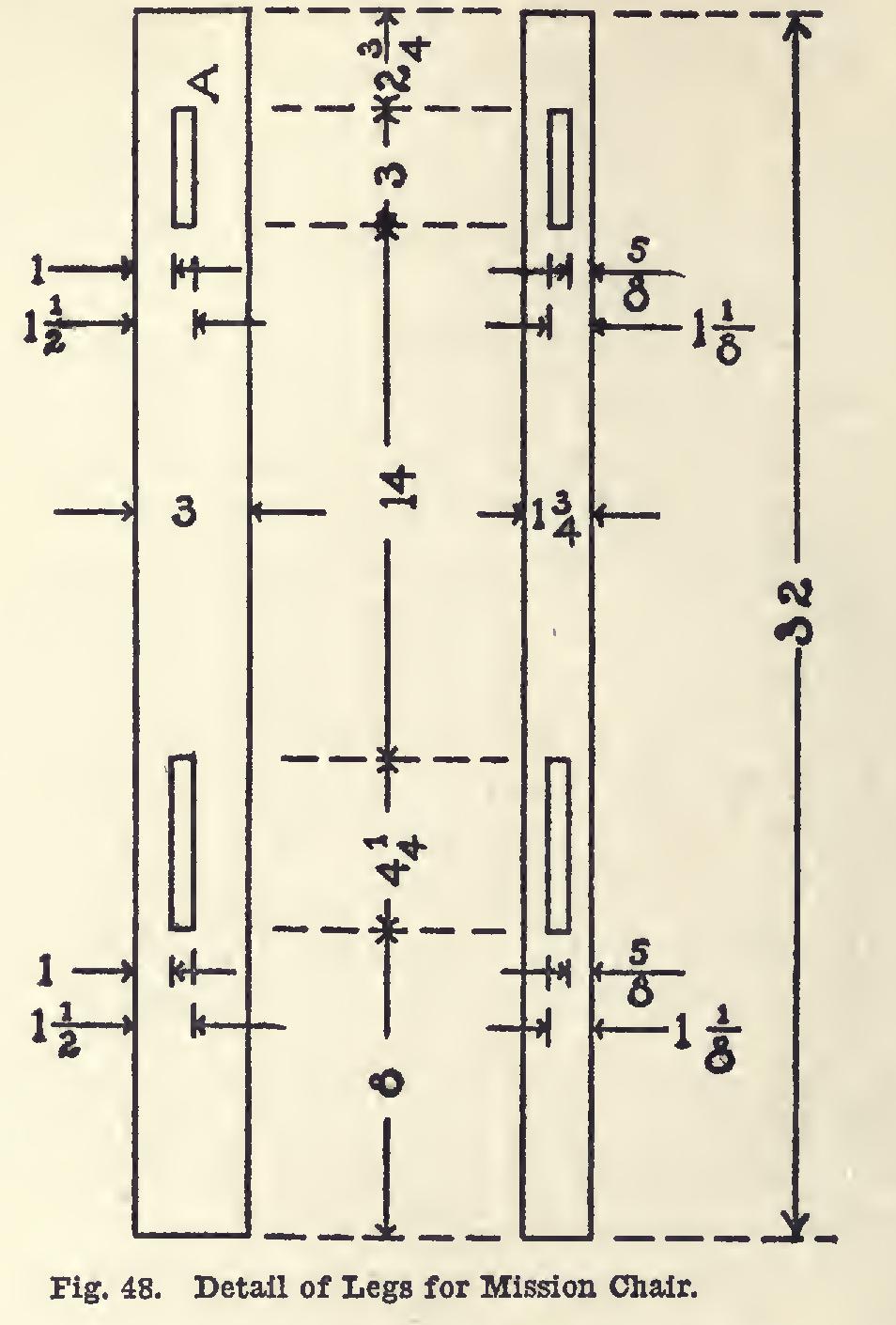 Next, stand the legs upright in the positions they are to occupy relative one to another, and mark with the pencil in some way to approxi mate the locations of the holes. Keep the marks just made on the inside of the legs. Remember that one rail—hence its mortises—must be omitted at the top. The mortise A, Fig. 48, is on two legs only.