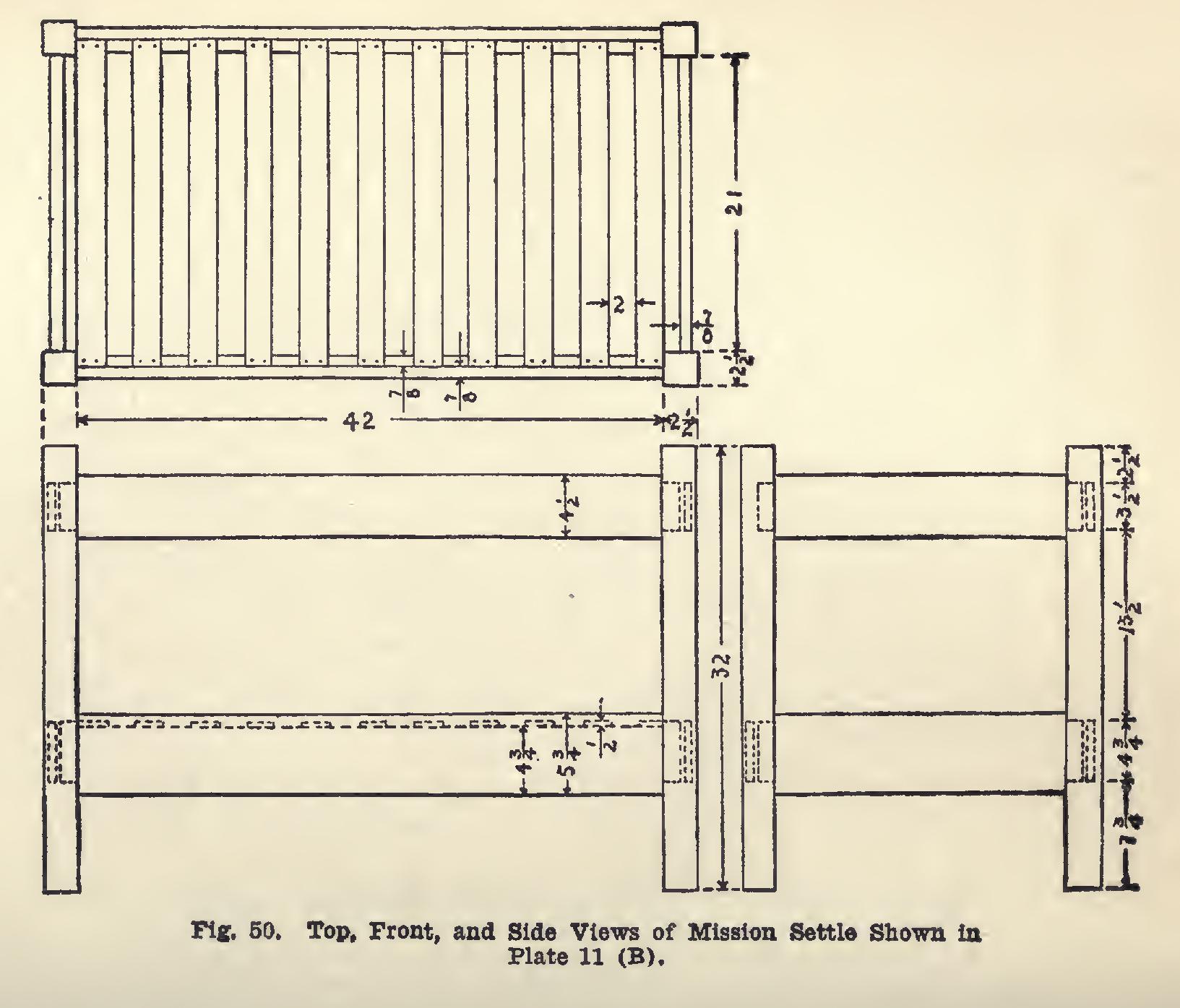 Fig. 49 gives the layout of the tenons. At A are shown the tenons for the front and back lower rails. Stand the rails on the edge, and even the ends. Measure from one end two inches, and square a sharp knife line across the two upturned edges. From this line, measure twenty-six inches, and repeat. There should remain two inches from this line to the remain ing end of the piece. Square knife lines around each end of each piece, to correspond with these lines.