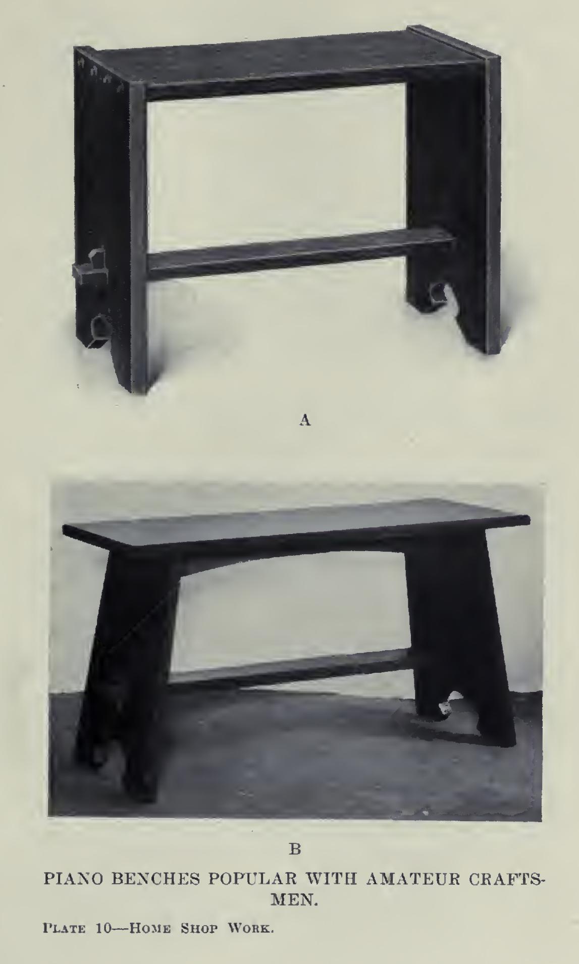 Another very satisfactory piano bench is illustrated in Plate 10 (B). In it the legs are set at a slight angle, and the top extends out over them. The construction of this bench is simple, and can easily be worked out along the lines of the other.