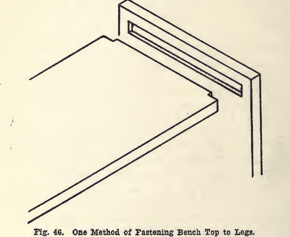 Fig. 46 shows a second way of fastening the top to the legs. A closed gain three-eighths of an inch deep and one and one-eighth inches wide, is chiseled in the leg. The opening lacks one' inch of extending out to the edges.