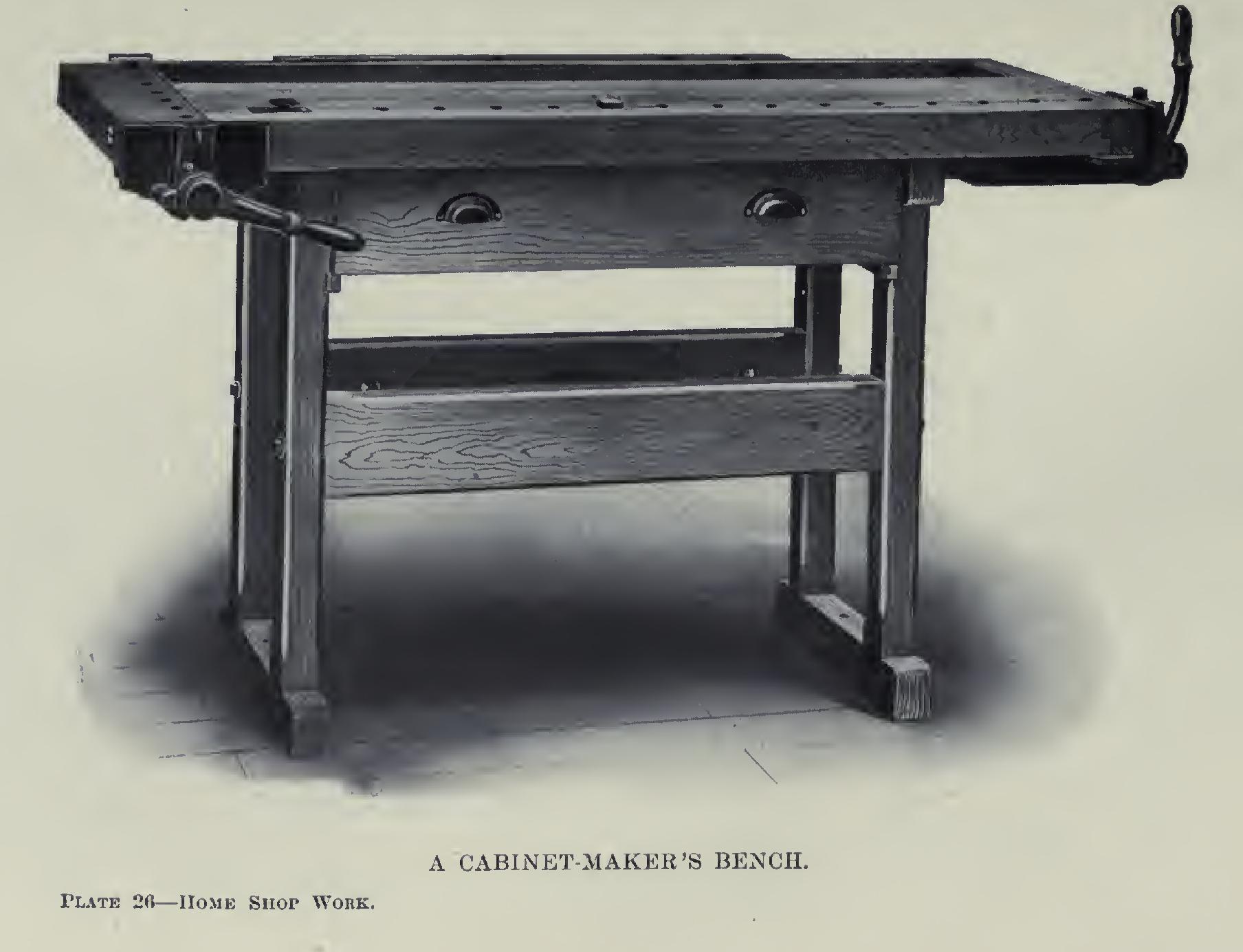 Place these pieces side by side in the vise with their ends evened and one set of face marks against the vise jaws. From each end, measure four inches and bore one-inch holes. Place the spurs of the bit in the crack between the two pieces; this will form a half-circle on each piece. Set the gauge to one-half inch, and connect these half-circles on each side of each piece. With compass or turning saw, saw along the lines far enough to allow the rip saw to enter; then finish sawing with this. Saw from one side of the piece a while; then reverse, and saw from the other side, repeating the change frequently as the sawing proceeds.