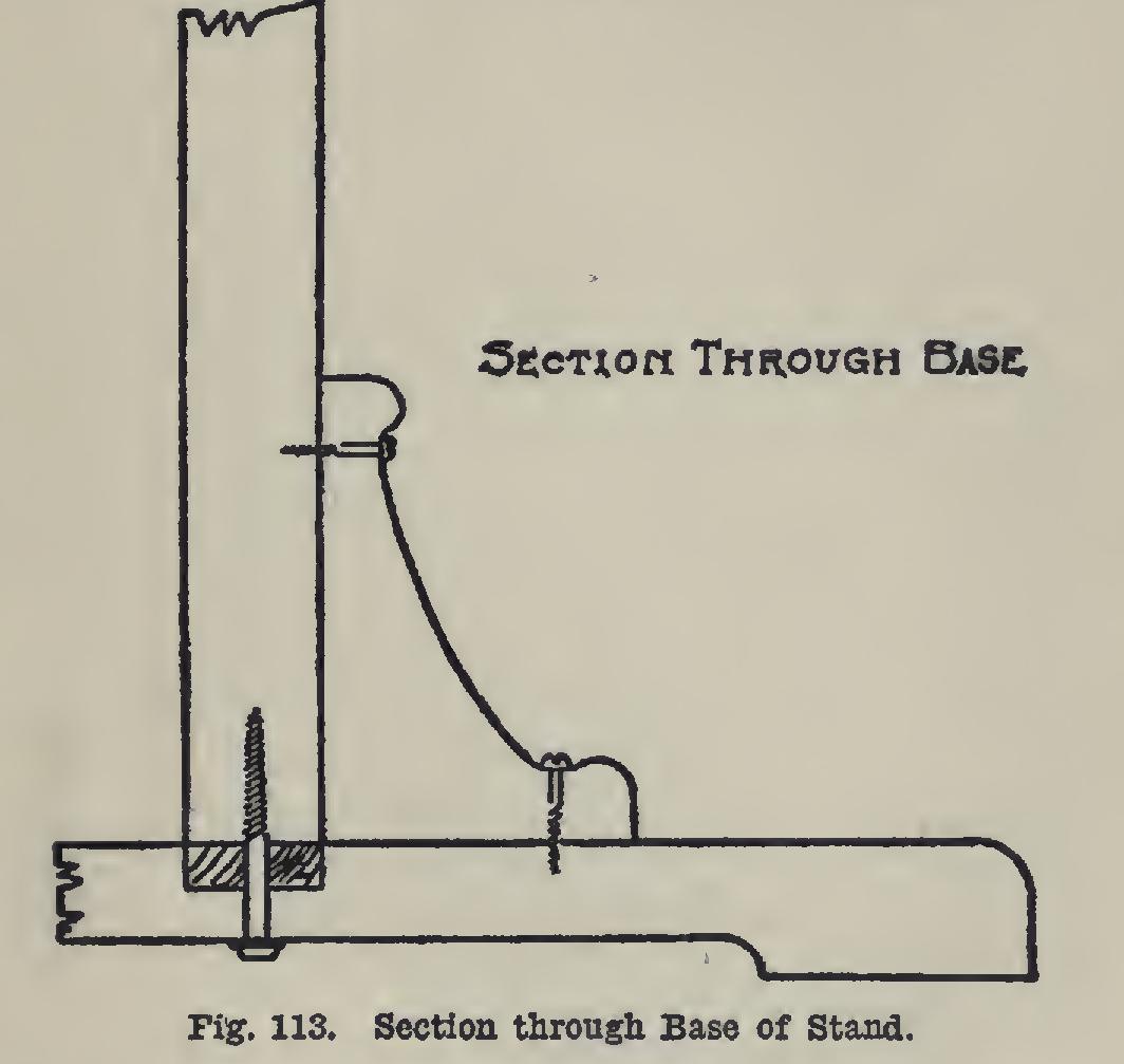 The four braces may next be laid out and sawed. It is a good plan so to place the pattern or templet that the grain of the wood may run diagonally to the sides. A paper pattern will do. The sides are respectively four and six inches, and must be square one with the other and with the face sides. The curve is to be drawn freehand upon the templet. A turning saw will be needed to cut the curves; and a cab inet scraper, well sharpened, for smoothing them: The saw should be made to cut close to the line, so that the smoothing may not be made any more laborious than is necessary. These braces are to be fastened to the upright and the base with round-head blued screws. Holes three-sixteenths of an inch in diameter should be bored as indicated in Fig. 113.