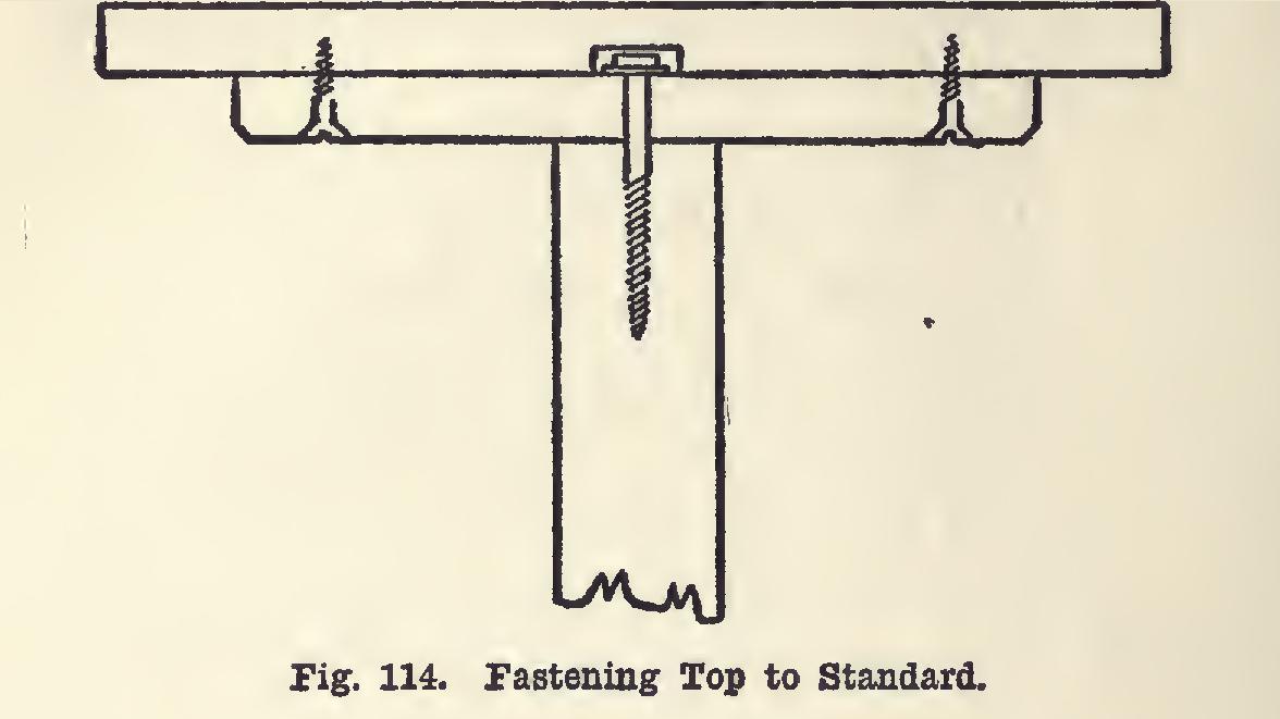 Three or four stout nails should also be driven through it into the post to prevent its turning it shrink so as partially to loosen the hold of the screw; or, better, mortise the top end of the post into this piece one-quarter of an inch deep. The top is next fastened to this piece by four or more screws, as shown in Fig. 114.