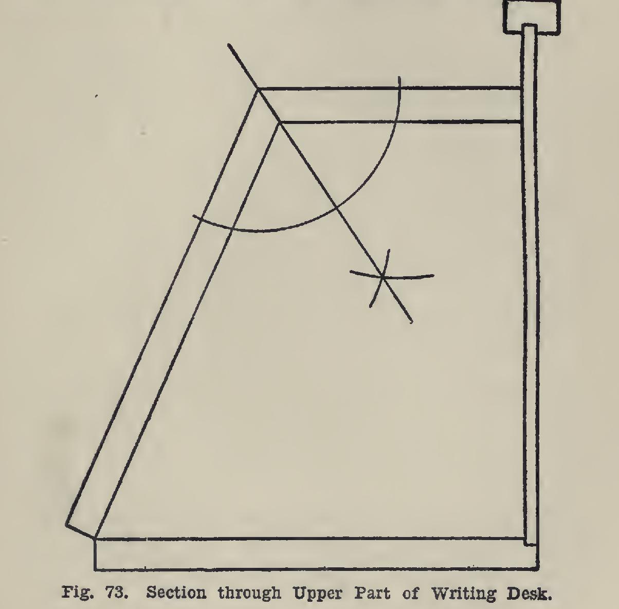 and one-eighth inches, and gauge for the width of the top side. It remains to set the bevel square to the proper angle, and plane the re maining edge to this angle. To get this angle, draw on one of the side pieces of the desk with a sharp pencil, lightly, so that they can be easily erased, lines to indicate the locations of the lid and top piece. A line drawn from the vertex of the outer angle to that of the inner angle, will give the slope (Fig. 71). If these angles are bisected, the result is likely to be more accurate (Fig. 73).