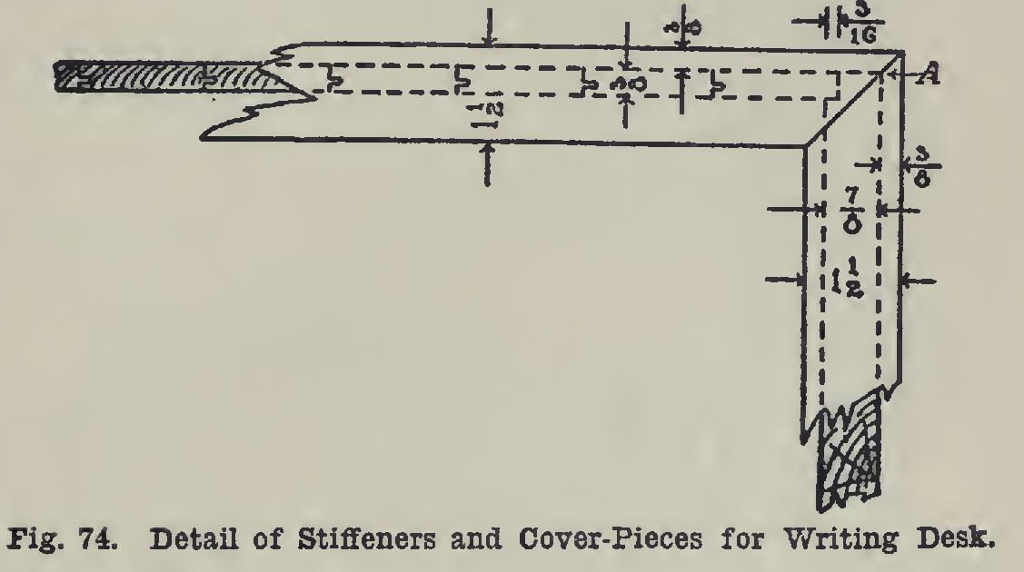 It should be noted that the distance from shoulder to shoulder of the tenons is twenty eight and three-eighths inches (Fig. 72), although the distance between the sides of the desk is but twenty-eight inches (Fig. 71). This added length is due to the "letting in" of the ends three-sixteenths of an inch at each end.
