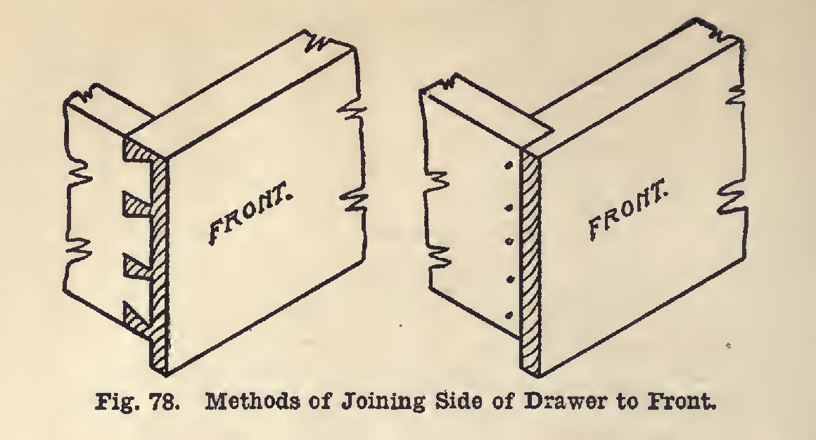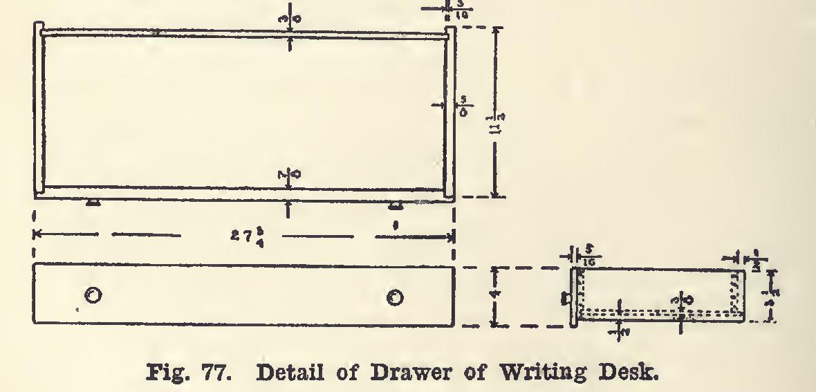 The drawer (Fig. 77) will require, in the rough, one piece of oak, seven-eighths by four and one-half by twenty-eight and one-half inches. This and all other stock should be mill planed to the proper thickness. For the sides of the drawer, two pieces five-eighths by four by twelve inches will be needed. These may be made of whitewood. One piece of whitewood three-eighths by eleven and one-half by twenty eight inches for the bottom, and one piece three eighths by three by twenty-eight inches for the back, should be got out.