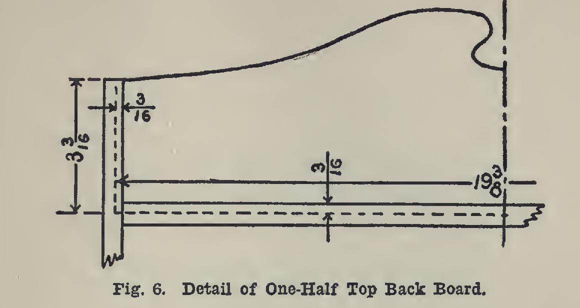 The board for the back (Fig. 6) should have an edge jointed and its ends squared. It should be nineteen and three-eighths inches long. At the ends it must be three and three-sixteenths inches wide. The rest of the width will be deter mined by the design used.