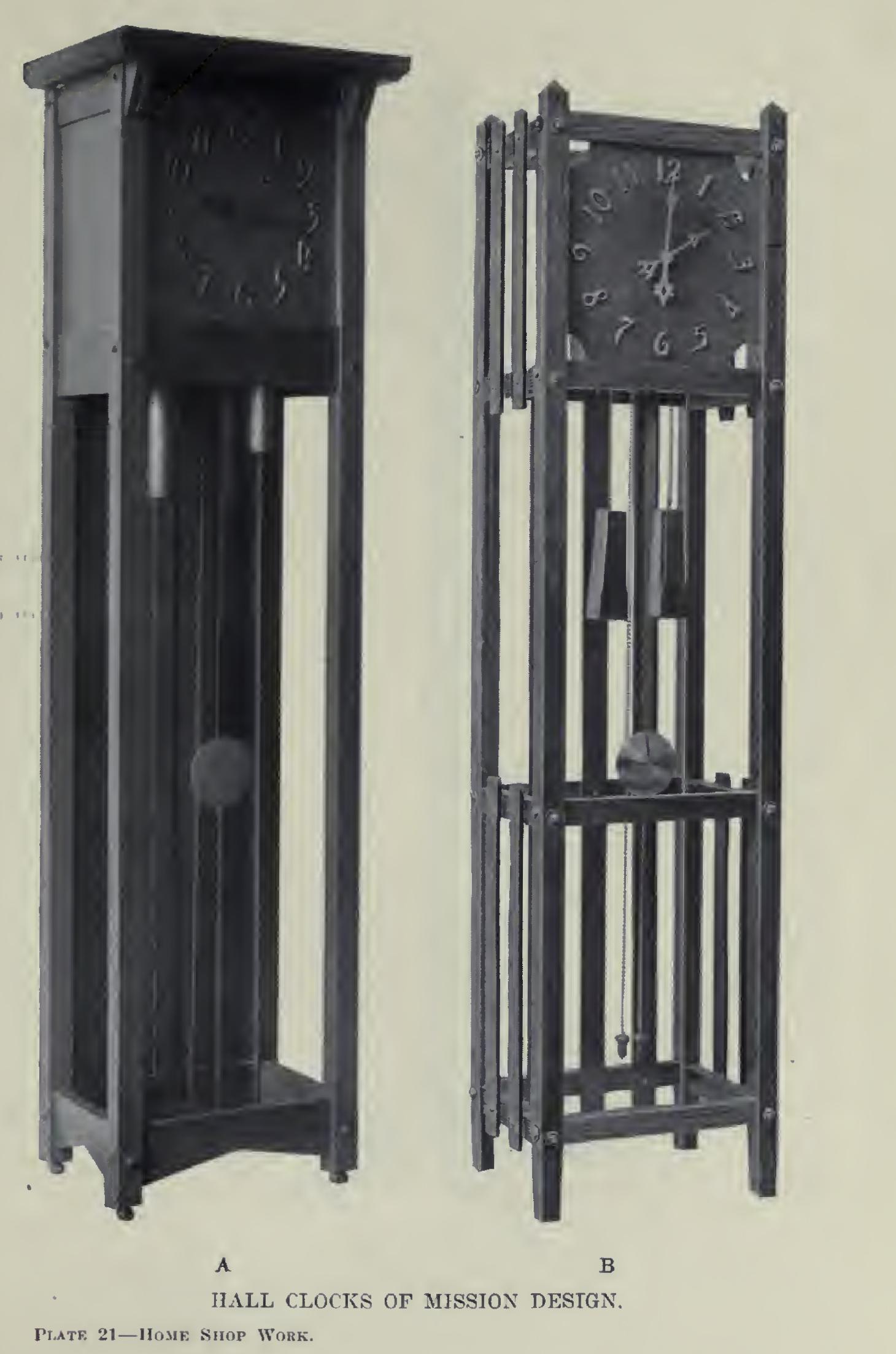 In the clock shown, lag screws, one-quarter by three inches, were put through the posts into the center of the tenons of each one and three quarters-inch bar. Washers were used, and the effect was quite pleasing. The posts should be bored with a one-quarter-inch bit, the tenons with a three-sixteenths to the depth the screw will enter.