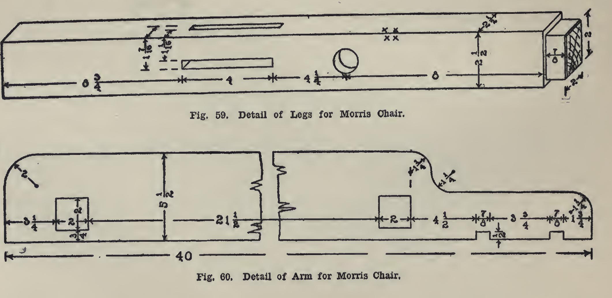 The legs of the chair, Fig. 59, may be cut to length. Four pieces each twenty-five inches long are needed. If these pieces are mill-planed to the correct width and thickness, and have their surfaces square one with another, all that remains is to remove the mill marks with smooth plane and scraper, and square one end of each piece properly. The other ends need not be squared now, for they are to be cut to slope after the frame has been put together.