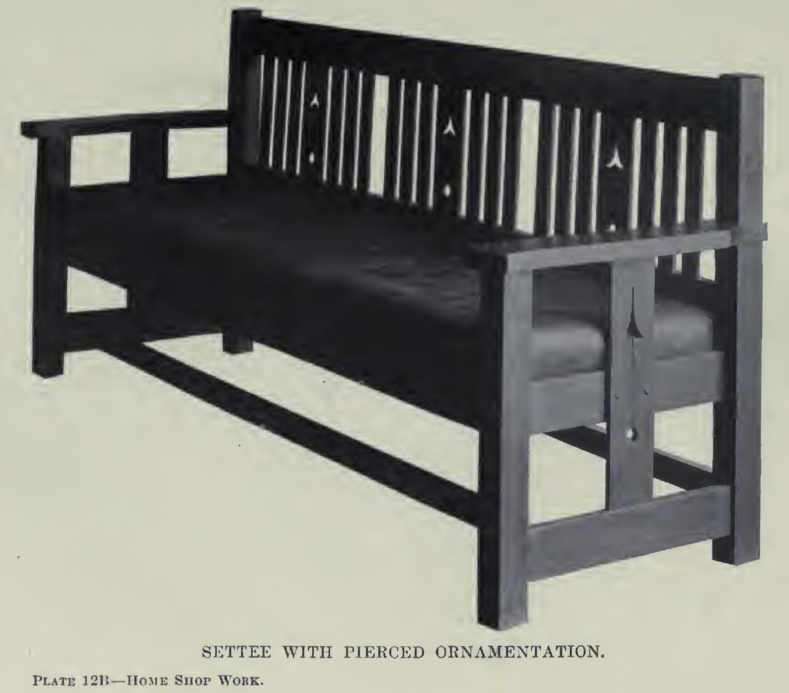 The back (Fig. 56) may next be made. The rails and their tenons have been described. For the stiles, square two pieces of one and one eighth-inch stock to a width of two inches and a length of twenty-eight inches. Bevel the top ends slightly. Place the pieces together with the joint-edges up; even the ends, and square sharp pencil lines across at the following con secutive points, beginning at the bottom ends: Four, one and one-half, five and one-half, one and one-half, five and one-half, and one and one half, five and one-half, then one and one-half inches. Set the gauge first to three-eighths of an inch, and mark between the lines one and one-half inches apart, on each piece; then set to three-quarters of an inch, and repeat. Out these mortises with the three-eighths-inch chisel, and number and fit the tenons in the usual way. In assembling use a clamp at each rail.