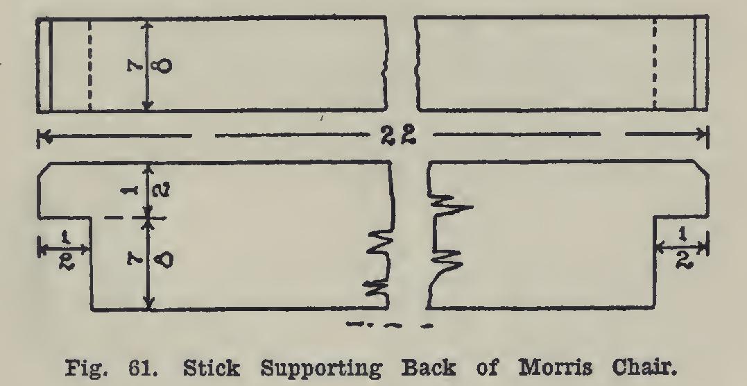 The stick which supports the back (Fig. 61) is made by squaring a piece of seven-eighths inch stock to a width of one and three-eighths inches, and a length of twenty-two inches. Lines are to be squared across one-half an inch from each end. The gauge should be set to seven eighths of an inch, and lines marked from the ends as far as the pencil lines. A slight bevel on the ends will remove the sharpness of the exposed end, Fig. 61.
