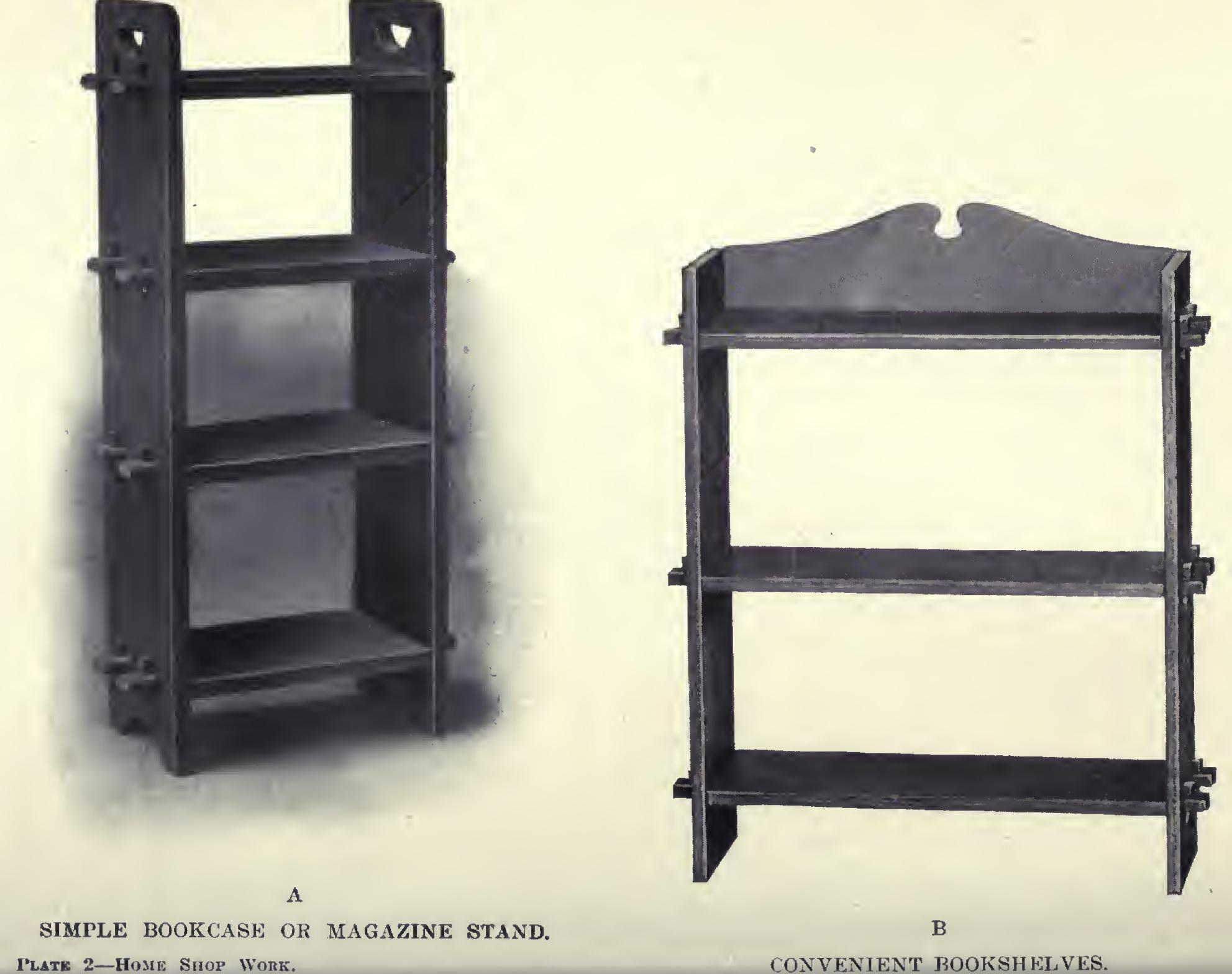 STAND A magazine stand is always a popular project; it is easy to make and is emphatically worth while. It makes a good piece to begin on. Plate 2 (A) shows one with keyed tenon fastenings and of the ever-popular craftsman design. Like all other craftsman designs, it is pleasing in its appearance because of its sim plicity and honesty. Such a stand would make a splendid place for keeping such books as are in constant use; in fact, it might be well used for both books and magazines.