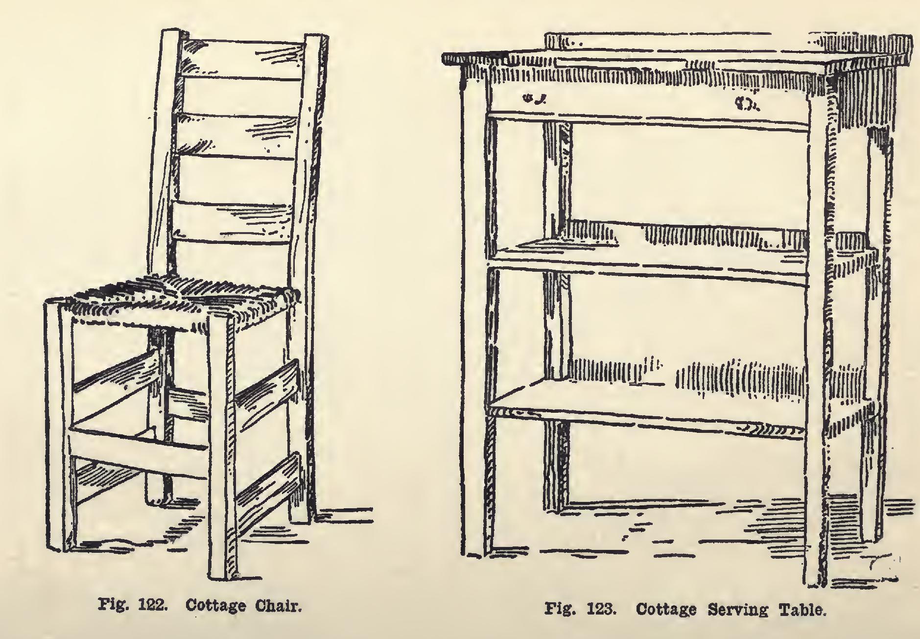 In Fig. 122 is shown a cottage chair. The size of the legs and the other proportions are to be determined by the craftsman himself. If a chair of light weight is wanted, legs one and one-eighth inch square will not be too light. The height of the chair from the floor, the height of the back, the width and depth of the seat, the width between the front and between the back legs, should not be fixed without first measuring chairs that are at hand. Unless one is ex perienced, his estimate of such proportions is likely to be far from correct. If you are an ama teur and are inclined to doubt this, suppose you make an estimate of the height of an ordinary chair seat, then put the rule on, and verify your estimate. The flag seating should not be put on until after the woodwork has been finished.