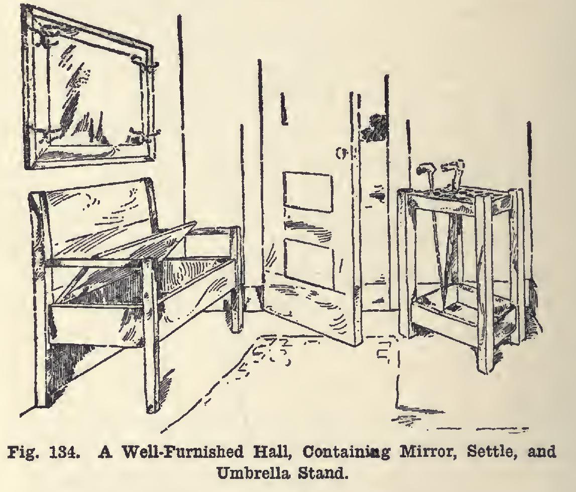 A well-furnished hall is shown in Fig. 134. These suggestions are somewhat out of the ordi nary, but are according to dictates of late fur niture design. These pieces may be made of plain or quartered white oak. The mirror should be furnished with beveled-plate glass thirty-two by eighteen inches. The frame for this should measure forty-two by twenty-eight inches, and can be made in two parts for con venience in working it, though a one-piece frame is better construction. The corners are mitered, splined, and glued after each part has been rab beted for the glass. Hooks of appropriate de sign and material can be purchased at the hard ware stores. Their location is clearly indicated in the drawing.