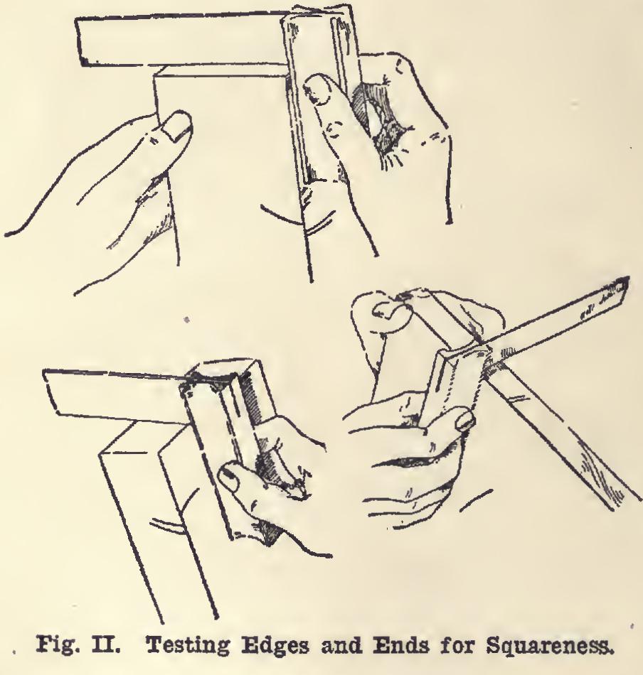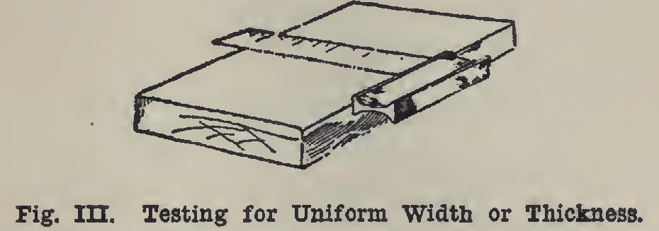 In testing a piece to see whether it is of the same width or thickness throughout its entire length, place the blade across the surface to be tested, and, holding the beam lightly against the working face or joint-edge, slide the try-square along the piece with the eye fixed upon the grad uations at the outer edge (Fig. III).