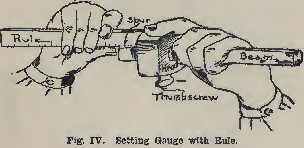 The graduations on the beam are seldom re liable. It is safer to set the gauge with the rule by measuring the distance from the spur to the gauge-block. This is done by holding the gauge bottom side up in the left hand. With the right, place the end of the rule against the head (Fig. IV). After the screw has been tightened, apply the rule again to make sure of the correctness of the setting.