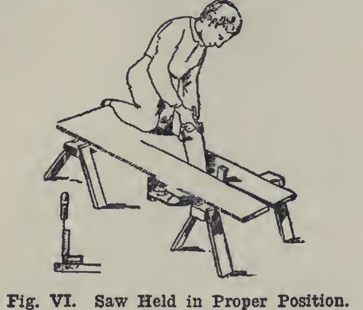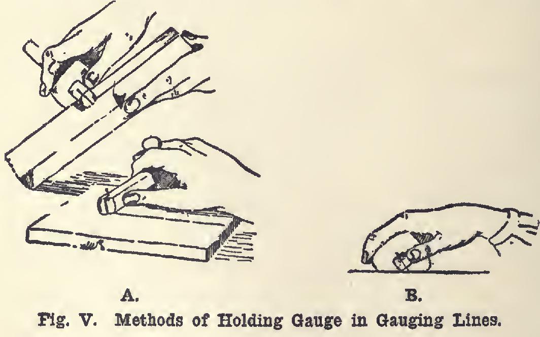 To gauge the line, take the tool in the right hand, three fingers grasping the beam, first en circling the head for narrow work, and the thumb back, or nearly back, of the spur (Fig. V A). The head should be kept against one or the other of the face sides. Begin at the end of the piece which is towards you; hold the block firmly against the piece; roll the beam forward until the spur barely touches the surface and make a very light line. Fig. V B illustrates the manner of raising the spur from the wood by raising the wrist during the backward stroke. It will be found convenient to hold the piece against the bench stop. This steadies the piece, and permits the worker to see how deep the spur is cutting and whether the head is against the face properly. Avoid deep lines. They are inac curate even if straight, and always cause trouble in the making unless the grain of the wood is perfectly straight.