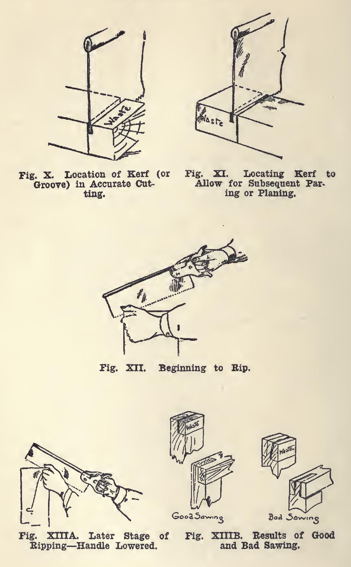 When ripping, place the piece in the vise, and begin sawing as indicated in Fig. XII. Place the saw so that just the whole of its thickness is in what is to become waste wood. Begin sawing as was done in crosscutting. Gradually lower the handle, while sawing, until most is being cut from the side nearest you (Fig. XIII, A). Re verse the wood several times, working down one side, then the other, until the cross-lines are reached. Fig. XIII, B, illustrates the results of good and bad sawing.