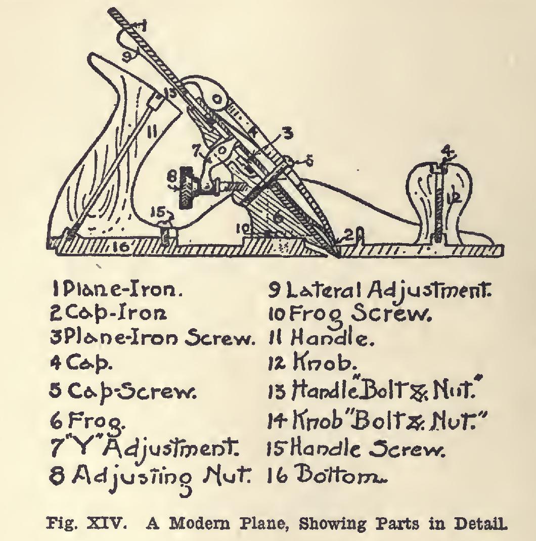 adjusting nut (Fig. XIV) that the plane-iron may cut a thicker or thinner shaving. The direc tion in which it should be turned to give the de sired result, must be learned by experiment, for in some planes it is reverse of what it is in others.
