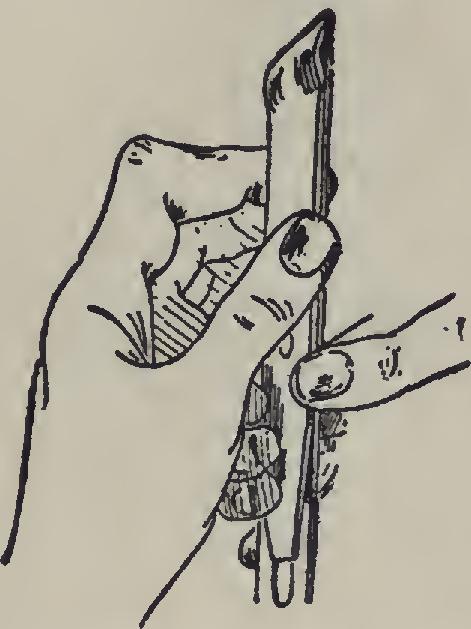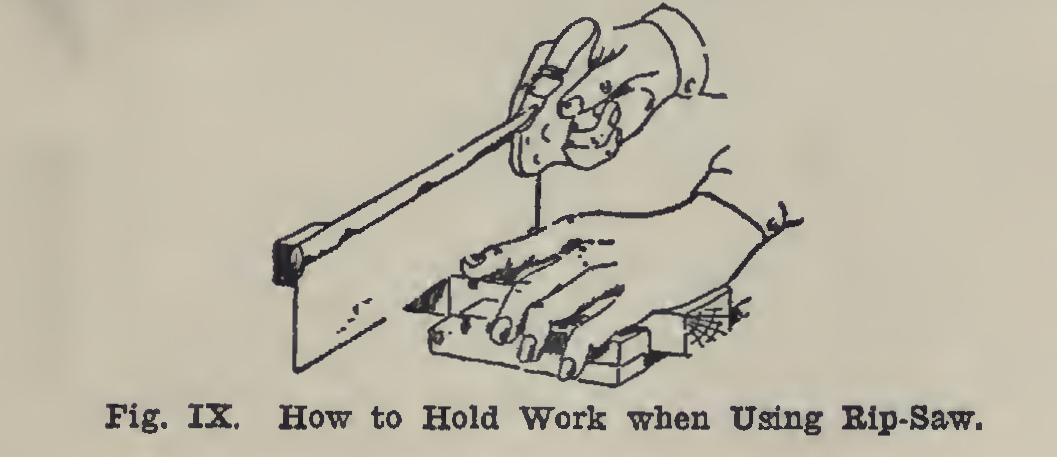 Saws. Saws which are used in cutting across the grain are called crosscut; those which are used in cutting parallel to the grain are called rip-saws. Fig. VI shows the saw in proper po sition. It should be held in the right hand, with the left hand grasping the board, the thumb of the left hand acting as a guide in the beginning. The thumb should be held firmly on the board, and the blade of the saw should be pressed lightly against it.