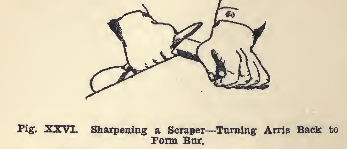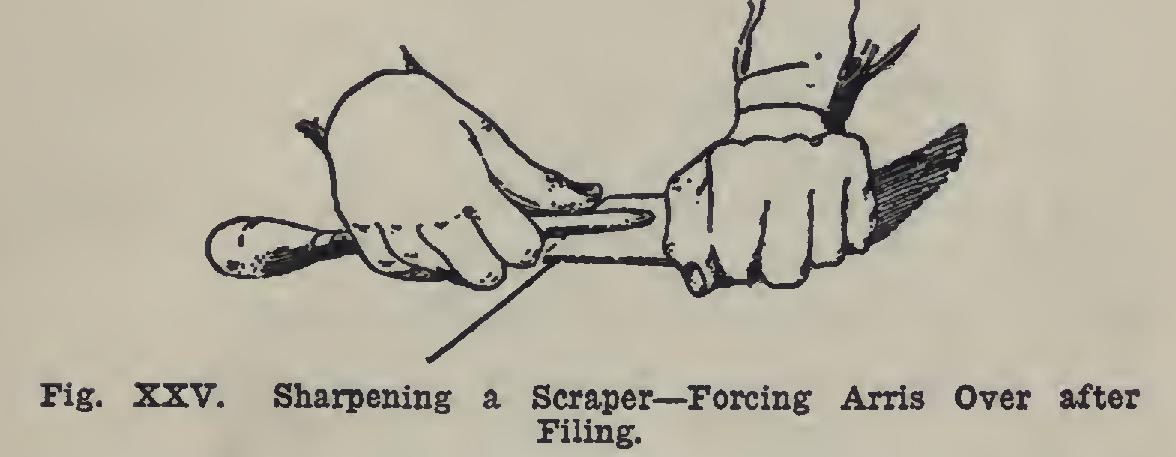 Scrapers may be pushed or pulled (Fig. XXIV). When properly sharpened, thin silky shavings will be cut off. The cutting edge of a scraper is a bur which is formed at an arris, and turned at very nearly a right angle to the sur face of the scraper.
