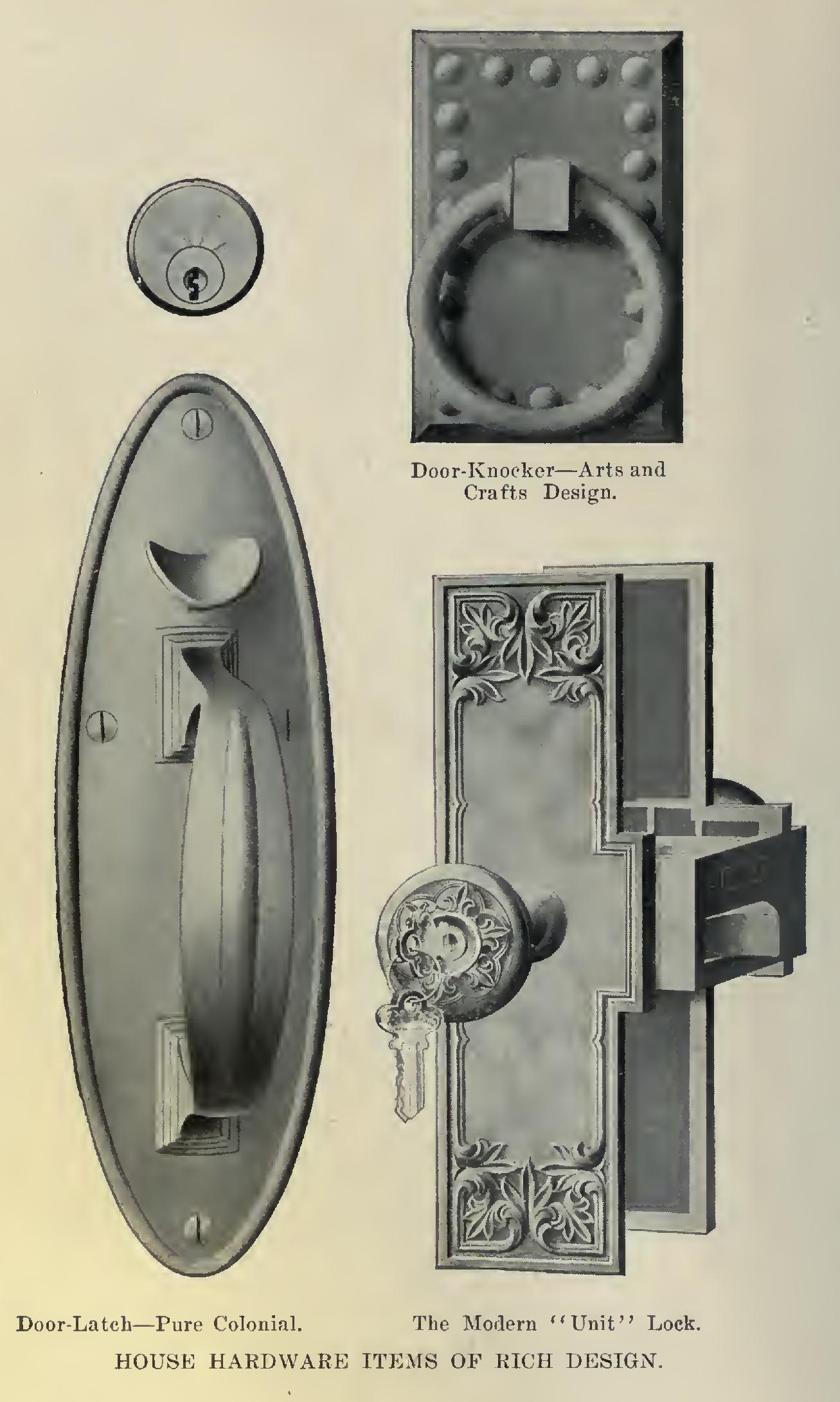 Latches and locks are divided into two gen eral types—either rim or mortise. Rim latches and locks are those which are screwed directly onto the stile of the door; while the mortise type are set into a cavity mortised into the stile and closed by the front plate of the lock or latch.
