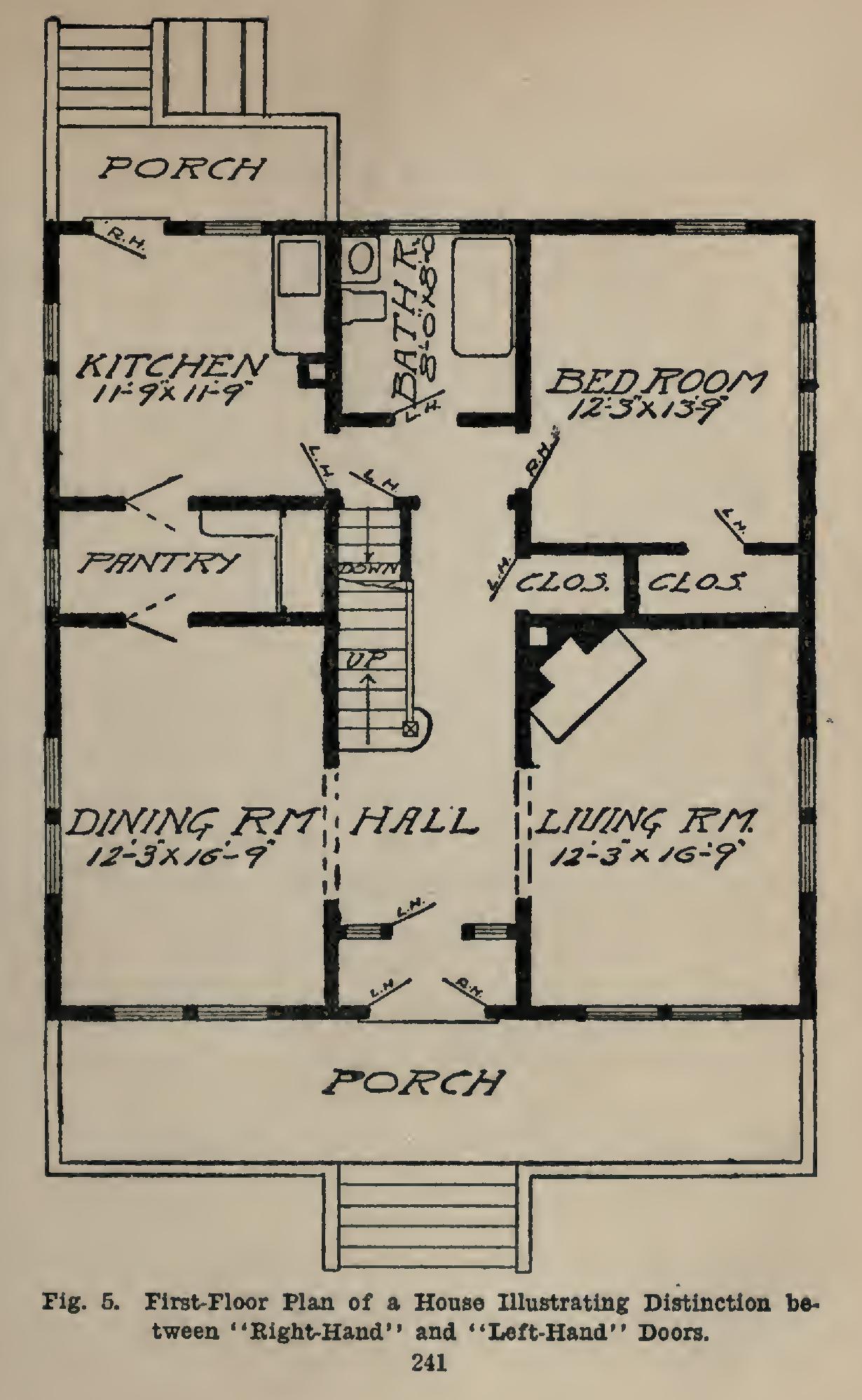 Fig. 5 shows a floor-plan of a house, with the doors marked R. H. for right hand, and L. H. for left hand, as the case may be. The rules which govern the marking of this diagram are as follows: The hand of a door is determined from the outside, this being the street side in case of an entrance door; the hall or corridor side, for a room door; and the room side, for a closet or clothes-press door.
