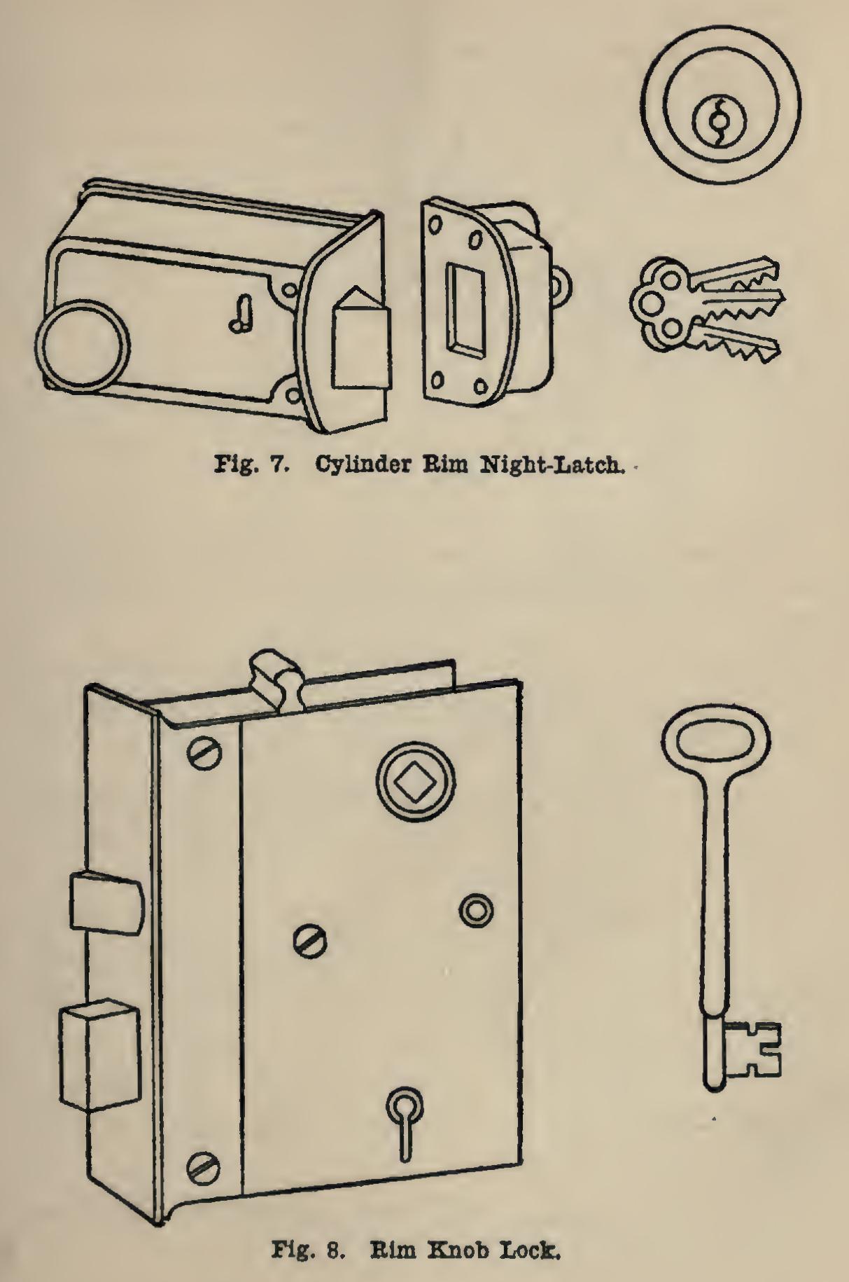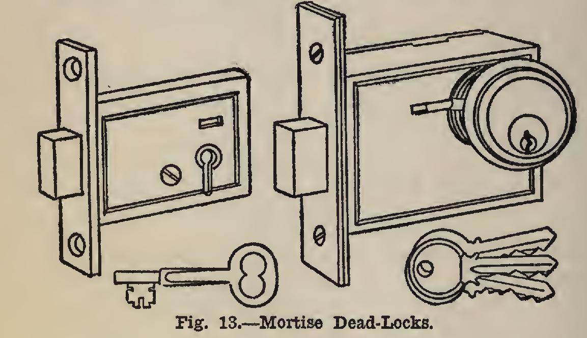 Fig. 13 shows two examples of mortise dead locks—one of the lever-tumbler type, and one of the cylinder type.
