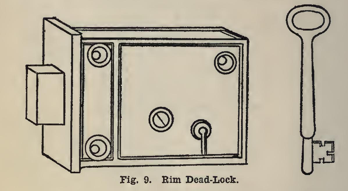 Fig. 9 shows a form of rim dead-lock. These vary in price from $2.25 per dozen (list price) up to $97.50 per dozen, thus showing the vari ation existing in this class of hardware.