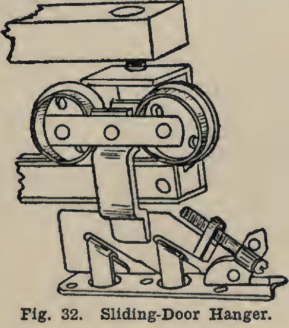 Sliding doors may be moved either by the old method of rollers or sheaves fastened to the bot tom part of doors and running on a light steel rail sunk in the floor, or by the use of overhead hangers as shown in Fig. 32. These hangers run on an overhead track supported in a special recess over the door. The track on which the rollers run is made of steel covered with strips of wood to make the action noiseless. Ball-bear ing journals are also used for this same purpose. The fitting of sliding doors should be left to mechanics practiced in this particular line of work, as an ill-fitting sliding door is a source of constant trouble.
