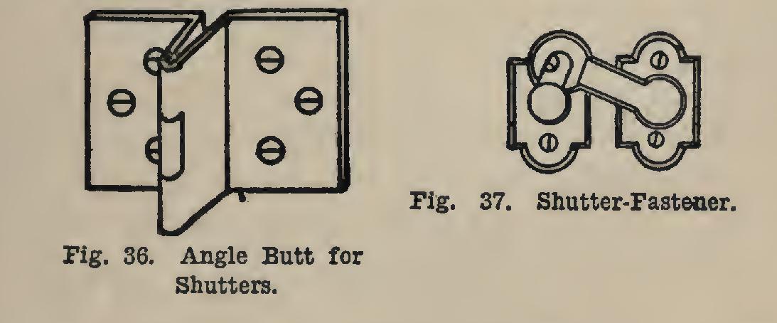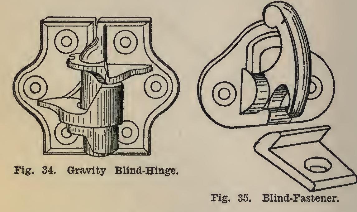 Fig. 35 shows a fastener used to secure blinds in place when closed. The upper part is to be fastened to the blind, and the lower to the sill. The fasteners commonly used to hold the blind back against the wall with the old style of wrought-iron hinge, consisted of a revolving leaf on the end of a pin. The pin was driven into the woodwork of the wall, and the leaf turned up over the edge of the blind. Other devices, such