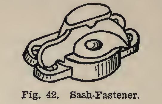 The type of fastener shown in Fig. 42 is con sidered to fulfil the requirement of drawing the two sashes closely together to prevent rattling and leakage of air, and, if secured by substantial screws, is probably as safe as any of this type of fastener. The cam action shown also forces both top and bottom sashes to a close fit in the window-frame at top and bottom.