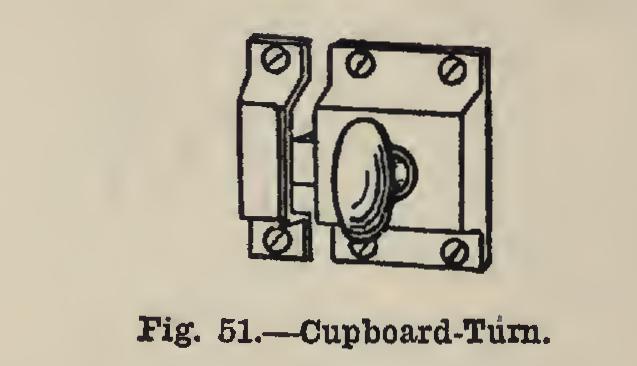 A good fastening for a cupboard door is shown in Fig. 51. This is known as a cupboard turn. These come in all metals and finishes and in plain and ornamental designs. The mechan ism consists of a spring bolt or catch operated by turning the knob shown in the figure. A cup board-catch which resembles the preceding fig ure with the exception that the knob slides in stead of turning, is also made.