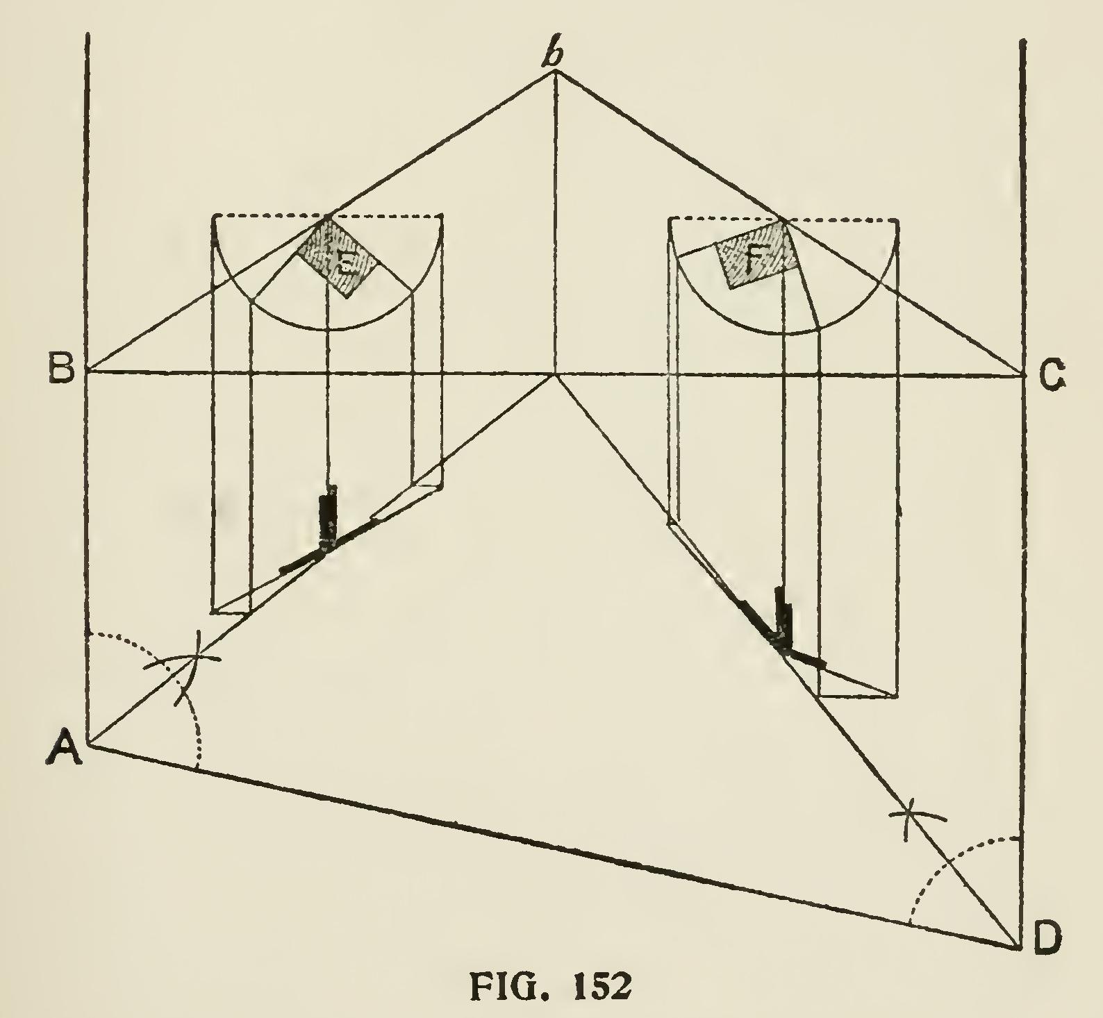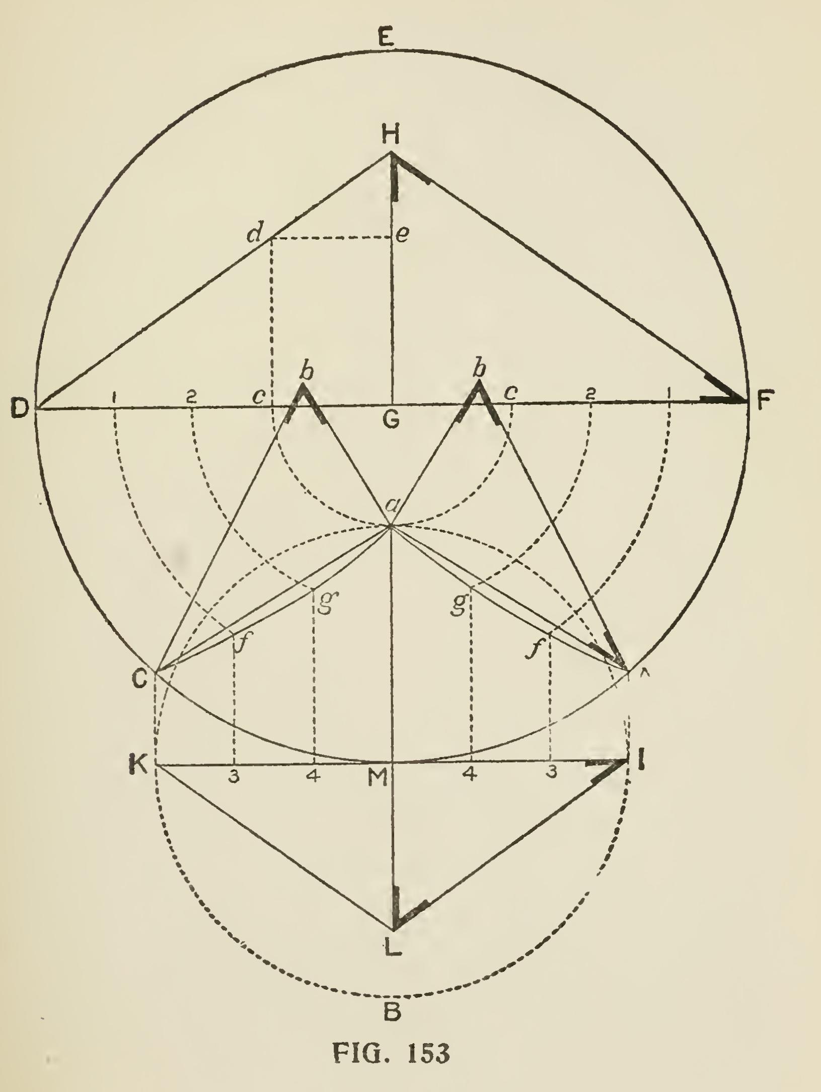 The following method, shown in Fig. 153, is an excellent one and will, no doubt, be found useful in cases such as mentioned : Let DH, FM he the common rafters of the conical roof, and KL, IL the common rafters of the smaller roof—both of the same pitch. On Gil set up Ge equal to ML, the height of the lesser roof, and draw ed parallel to DF, and from d draw cd perpendicular to DF. The triangle Ddc will then, by construction, be equal to the triangle ELM, and will give the seat and the length and pitch of the common rafter of the smaller roof B. Divide the lines of the seats in