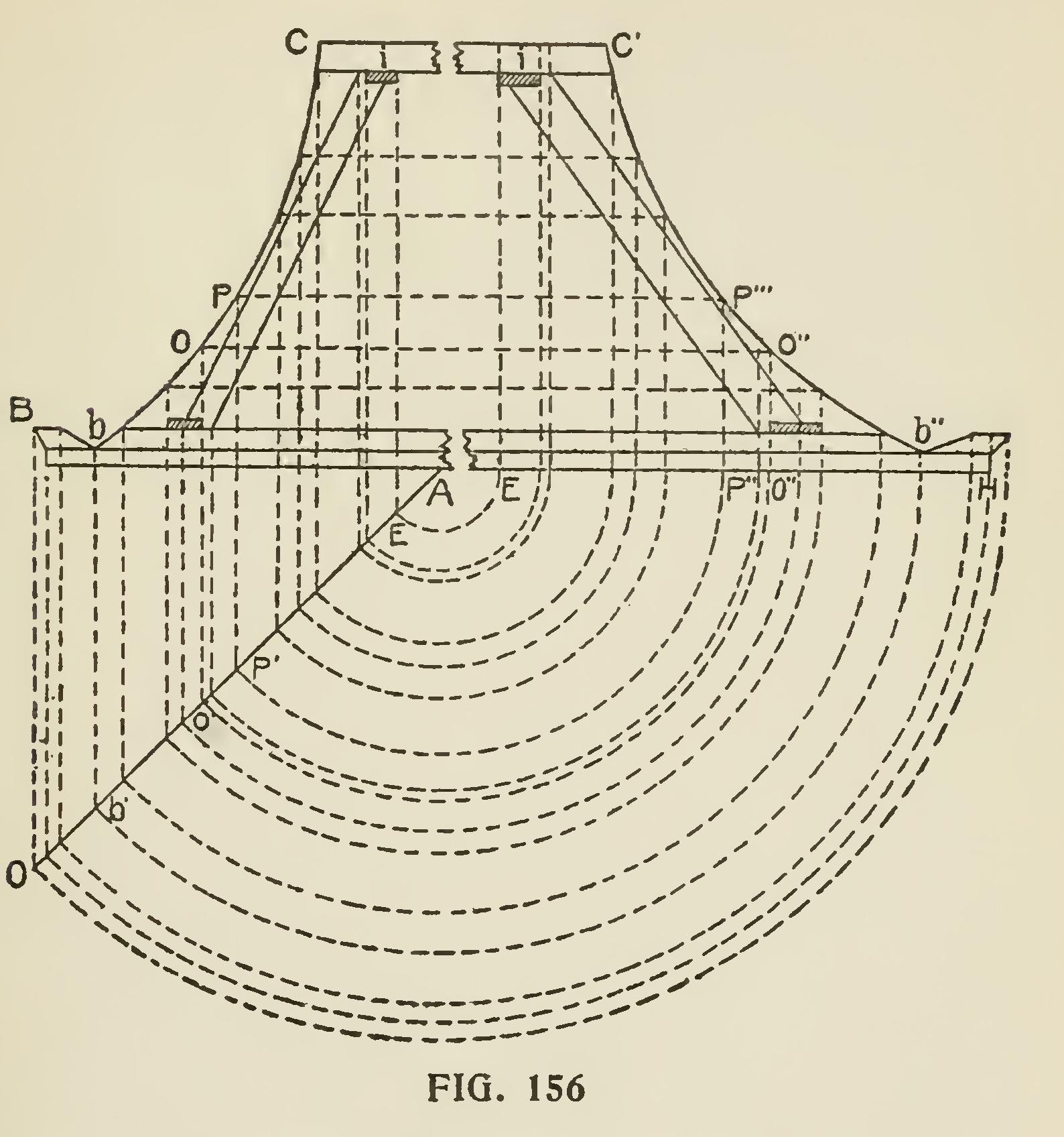 Fig. 156 shows how to find the angle=rafter and angle=cornice bracket, when the section as above described has been drawn. Let ABc repre sent the given section on the drafting board or floor. Draw the line AO at an angle of 45 degrees with AF. Then from any points C, P, 0, etc., of the section as shown, draw lines perpendicular to AF, and intersecting AO.