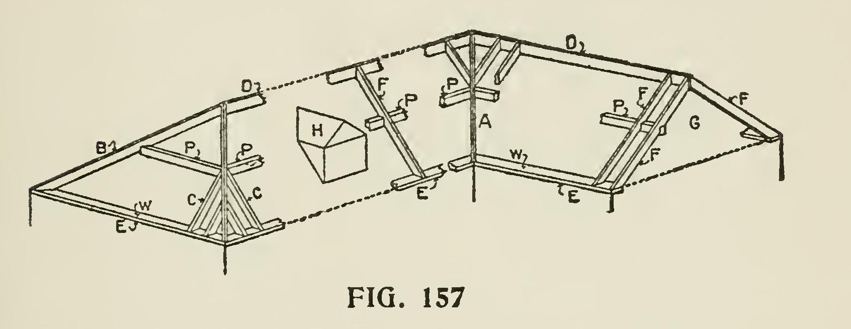 In Fig. 155 we have a section of a similar roof with straight sides. The different parts are lighter than those of Fig. 154, and the construc tion is adapted for a balloon frame building. The letters in Fig. 155 denote the same parts as the same letters in Fig. 154, and the explanation of Fig. 154 will answer for Fig. 155 so far as the same letters are concerned. Pc is the balloon frame studding; c, a longitudinal piece for the floor joists to rest upon. The studs are cut out at the top to receive the piece c, and will thus prevent the frame from spreading.