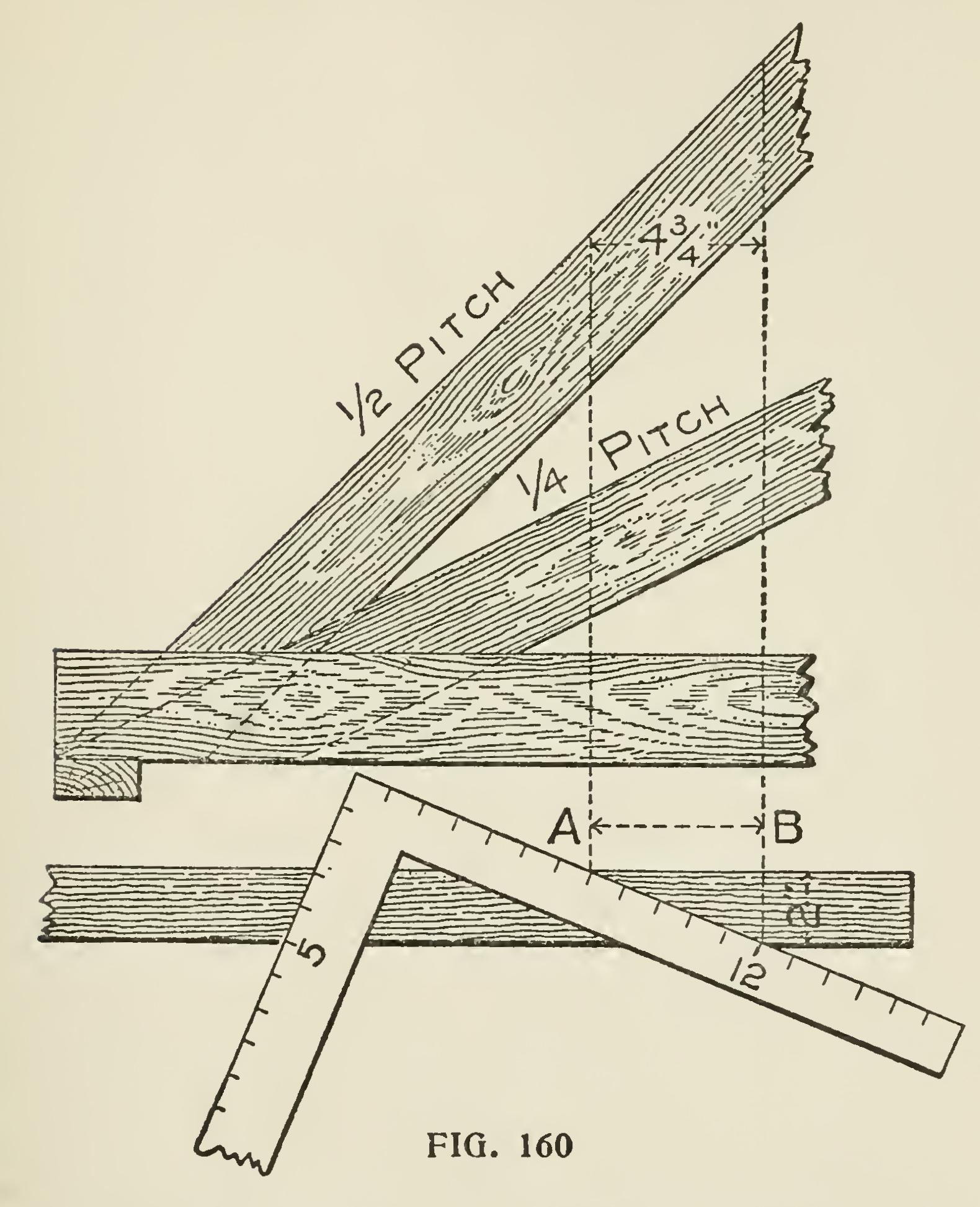 The following illus trations and reading matter are from Mr. Woods, and are largely self-explanatory. They show the lengths and bevels of hips and jacks of an octagonal tower roof. The seat and plumb cuts are found in the usual way of taking the proportion of the run and rise on the tongue and blade, but there must be an additional or diagonal cut across the back of the jack to fit against the hip, as shown in Fig. 159, by the dotted lines at A-B. These lines are always vertical and the same distance apart regardless of the pitch given. The diagonal line from A to B across the back of the jack de termines the angle. Fig. 160 illustrates this point. If there was no pitch at all then 5 and 12 would give the cut. These figures also give the starting lines A and B which, since the rafters are of the same thickness, will remain at right angles the same distance apart. Thus, if the rafter be 2 inches thick, the lines A and B will be inches apart.