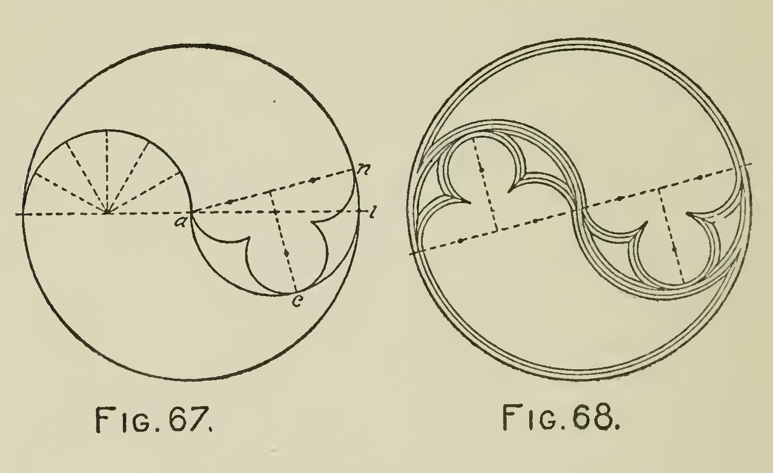Fig. 67 is the elementary study upon which the subsequent figure is based. Having drawn the circle, describe on the diameter two opposite semi-circles, meeting at the center, a.