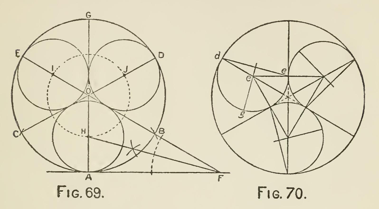 We show the method of obtaining these curves in Fig. 69 : At any point, as at A, draw a tangent, and A G at right angles to it. From A, with radius 0 A, cut the circle in B and C, and the tangent in the point F, using B as a center.