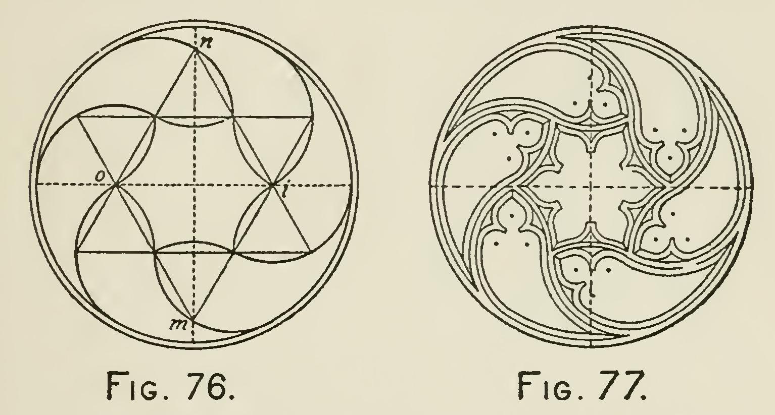 Fig. 76 shows the skeleton lines of Fig. 77. Divide the diameter into four equal parts, and on the middle two, as a common base, construct the two equilateral triangles oin and oim.