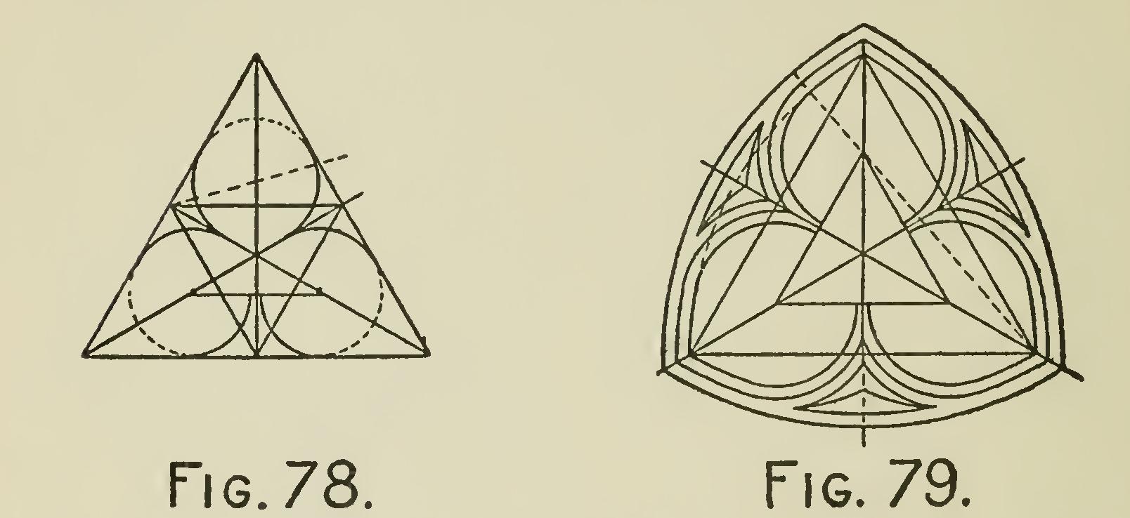 These curves, in Gothic architecture, are called foliations, or featherings, and the points at which they meet are called cusps. The completion of this study is shown in Fig. 71.