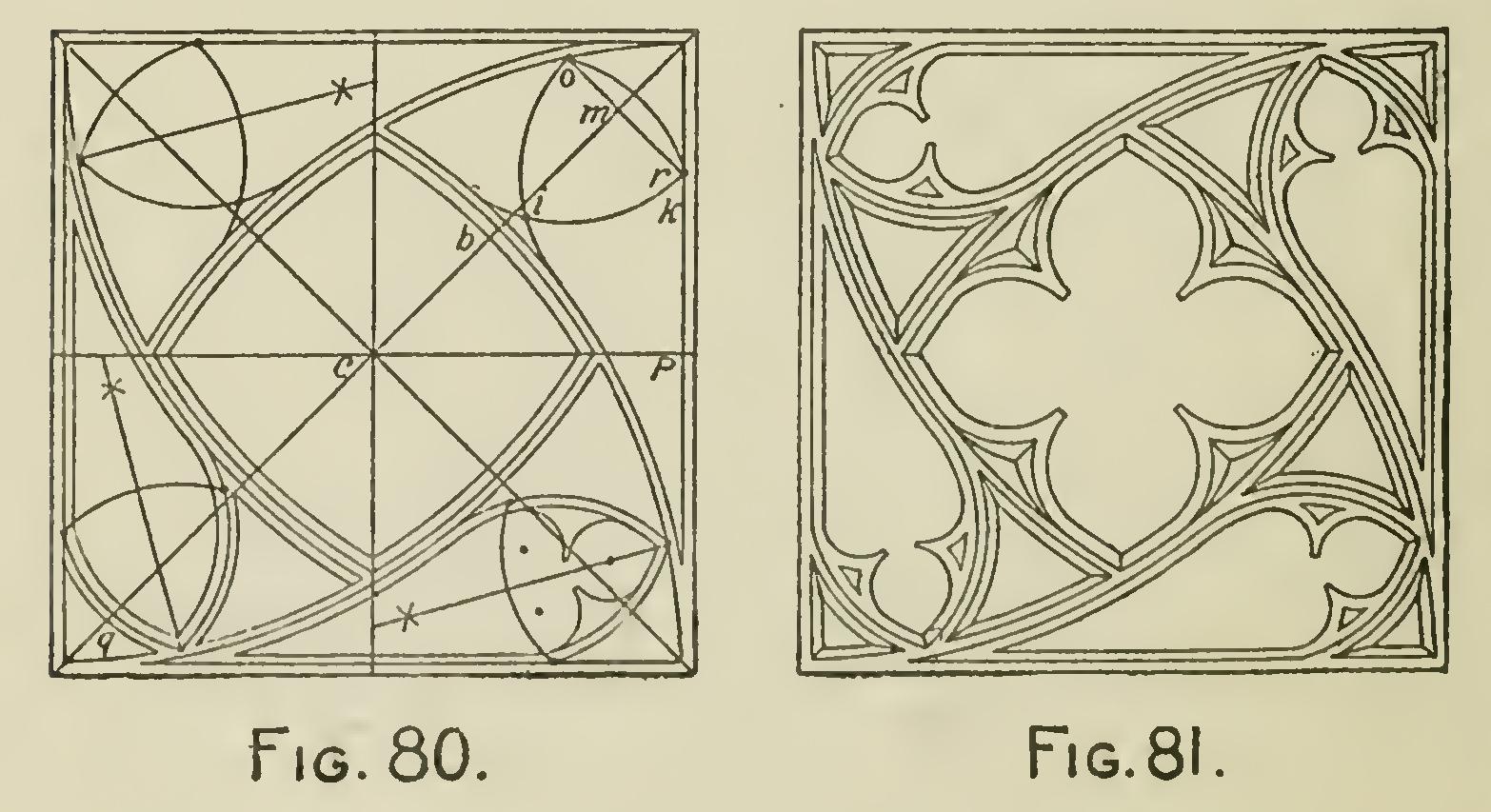 Fig. SO shows the construction for the tracery in a square panel. From each of the angles of the square (the inner one in this figure), with a radius equal to the length of the side of the square, de scribe arcs; these intersecting will give a four sided curvilinear figure in the center. Draw diagonals in the square.