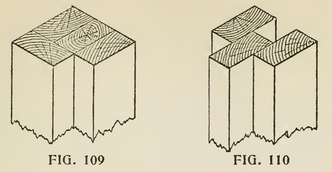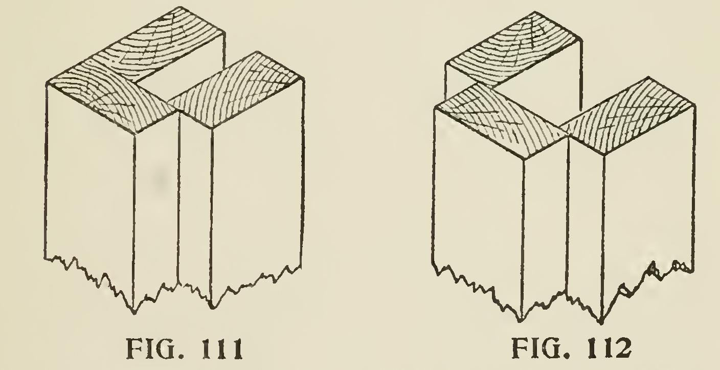 Fig. 110 shows an easy way and would be all right if the thickness of two was the exact width of one, but many times they are not, and so it is better to nail them together, as in Fig. 111. We have made them this way for years and we con sider them a very good corner.