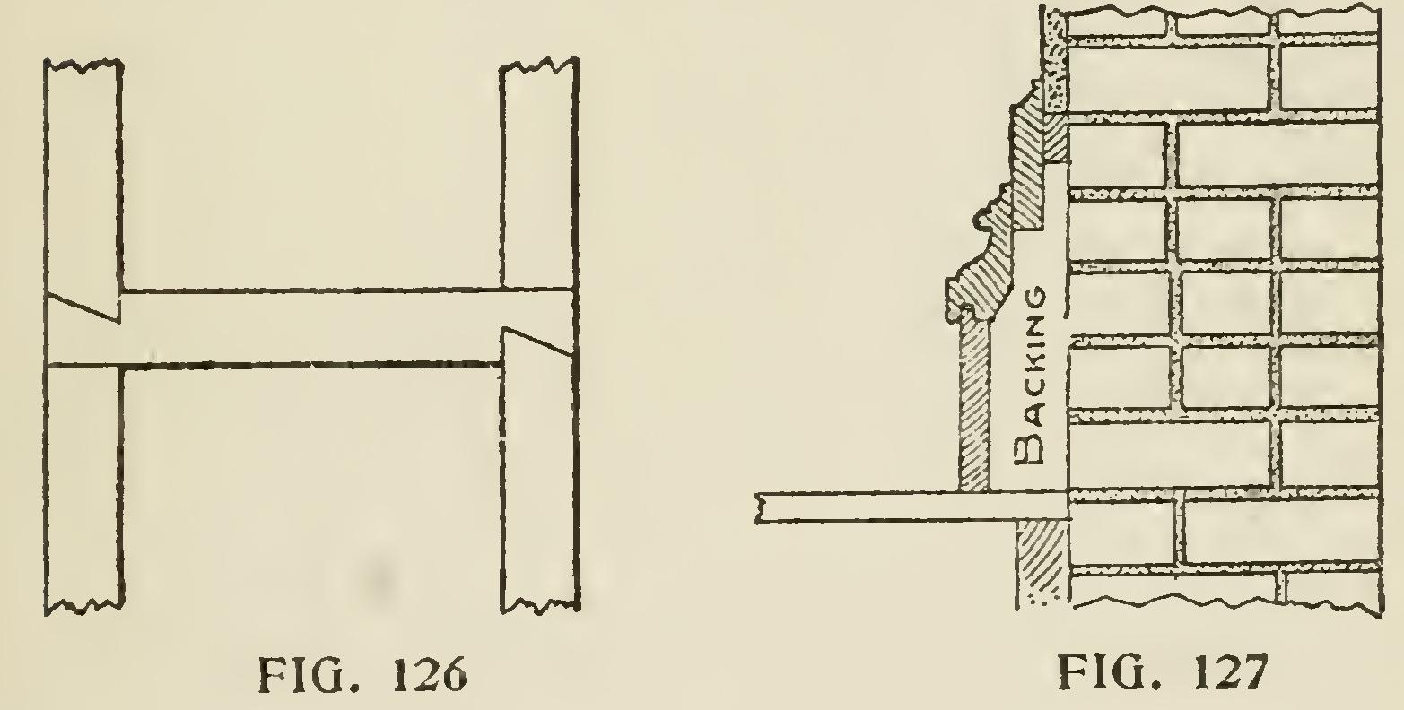 Backings are pieces of wood framed in between the studding or other work to form a solid back ing for shelving, plumbing or other fixtures. Sometimes these pieces are framed in lieu of nail ing, as shown in Fig. 126; but for all practical purposes this is unnecessary work, because if properly framed and nailed will be sufficient for most any kind of work.