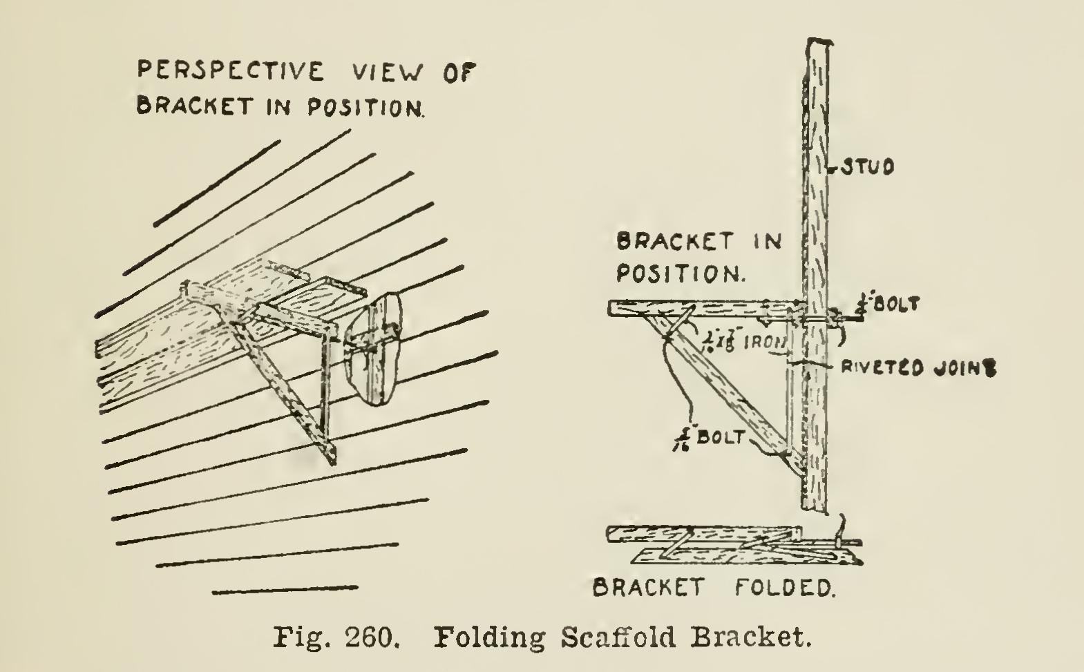 Scaffolding brackets to be used without sup porting legs are shown in Figs. 258, 259, and 260. The (Efferent forms are interesting.